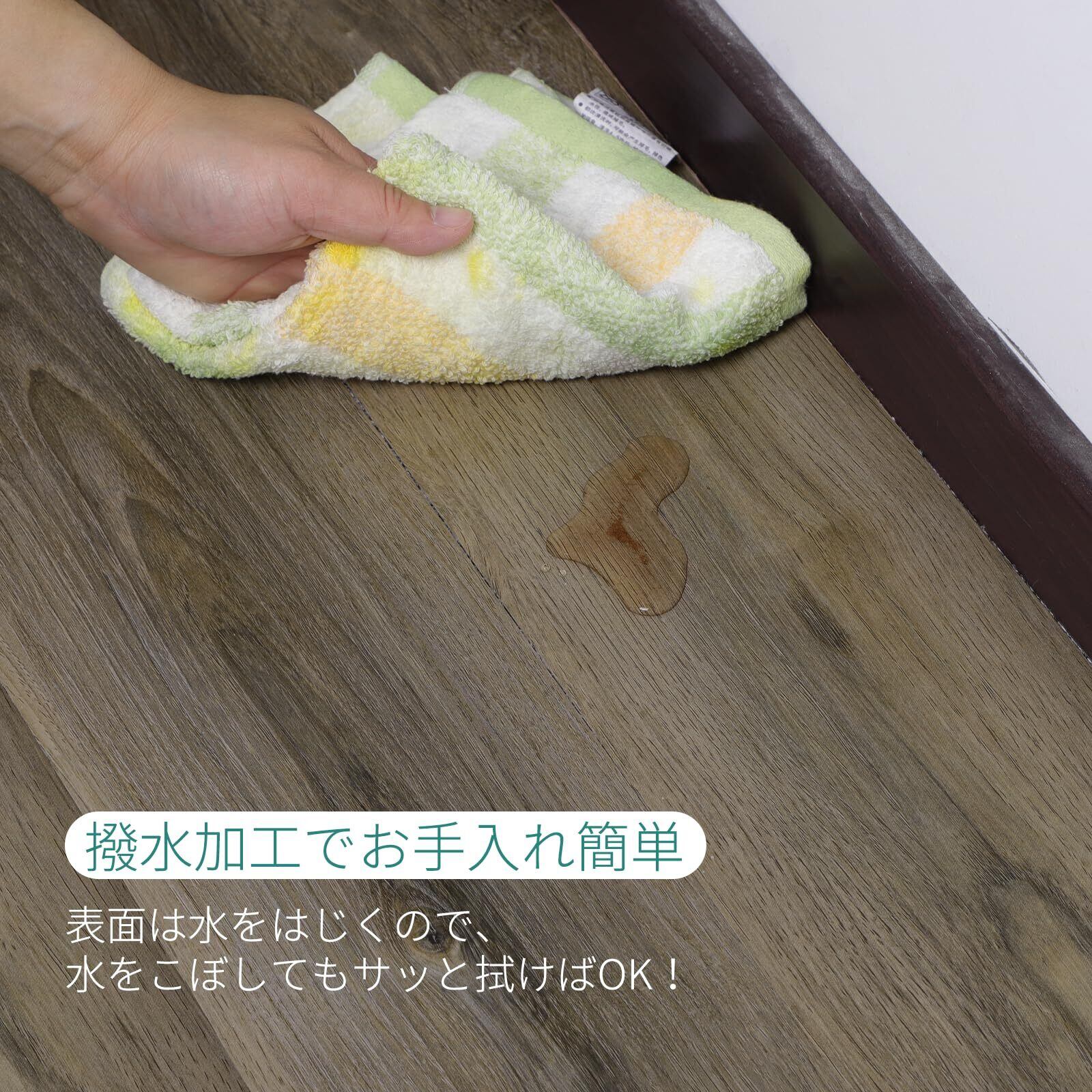 滑り止め&はっ水加工:表面には、エンボス処理が施されています。リアルな質感を再現するだけでなく、滑り止め効果もあります。ペットや子供がいる家庭でも安心してご利用いただけます。はっ水加工で、飲み物をこぼしてもサッと拭きとれて、シミになりません。お手入れラクラク