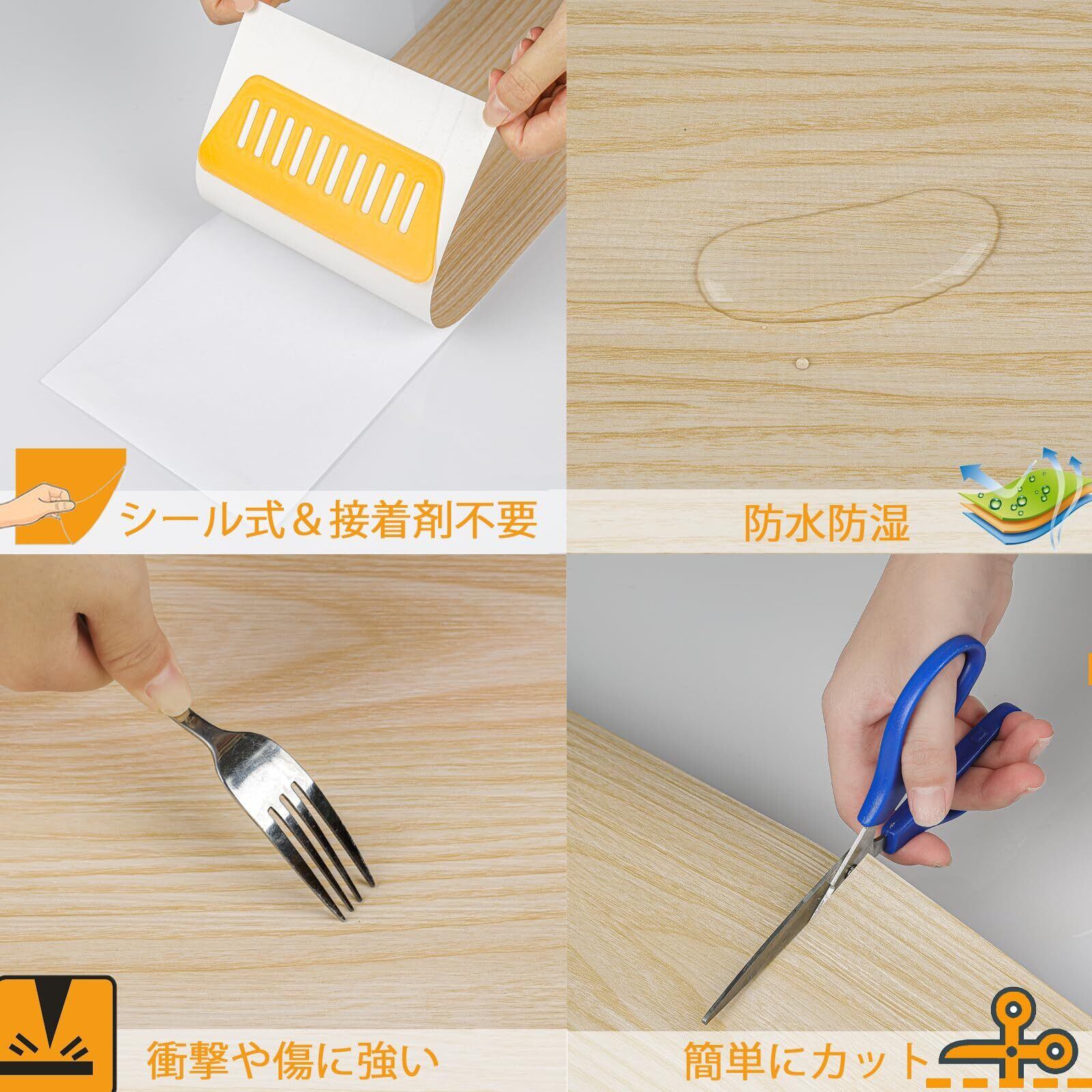 【貼るだけで簡単】 裏面は粘着性があり、シールのように床にペタッと貼れます。接着剤不要。置くだけフロアタイルなので、初心者や女性一人でも楽に貼り付けることができます。本製品の貼り付けには専門的な道具は必要ありません。長さと幅はカッターで簡単に切断して調整可能です。※最適な接着効果を得るためには、表面が清潔、乾燥、滑らかになるように下地床を用意してください。