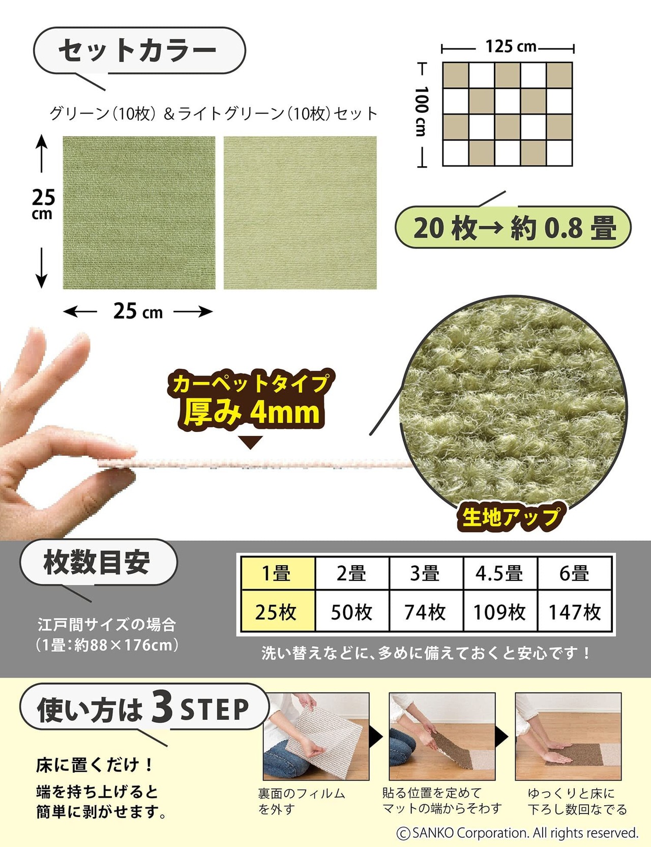 サンコー三つ葉(Sanko Mitsuba) 【日本製 撥水 消臭 洗える】サンコー ずれない タイルカーペット 25×25cm グリーンセット 20枚組 カーペットタイプ おくだけ吸着タイルマット ジョイントマット OF-63 | Bloomia