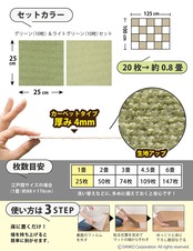 おくだけで取り付け、取り外しも簡単なタイルマット。生地が薄いので、つまずきにくく、扉の開閉の妨げにならないので小さなお子様や車椅子のお年寄りの方にもお使い頂けるバリアフリータイルマットです。スペースに合せて組合せ自由に敷いて頂けます。裏面は吸着加工で掃除機を使っても吸い上がらないから、お掃除もラクラク。汚れたマットだけお洗濯できます。ハサミで手軽にカットでき、カットしてもほつれません。1枚25cm角でグリーンとライトグリーンの20枚セットです。