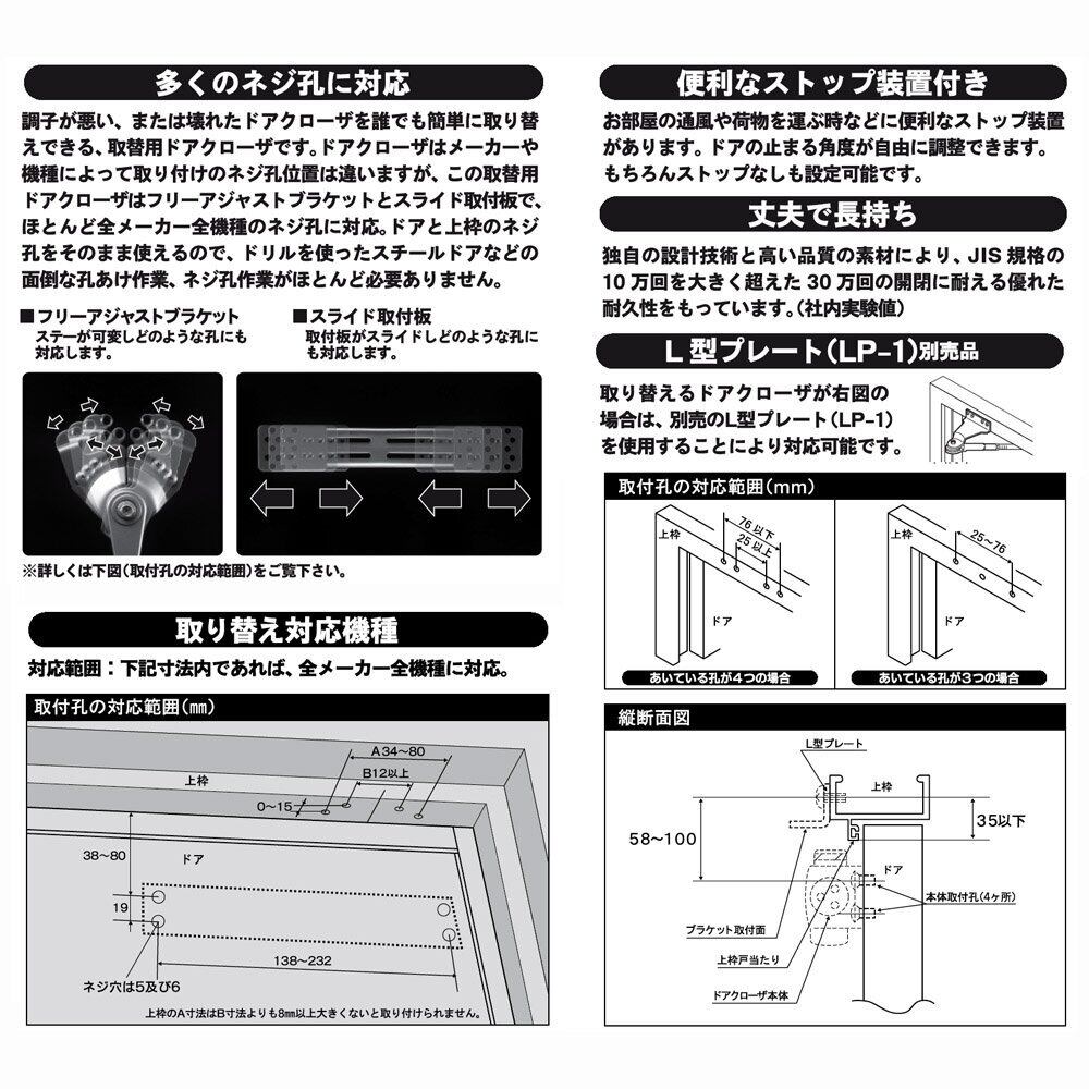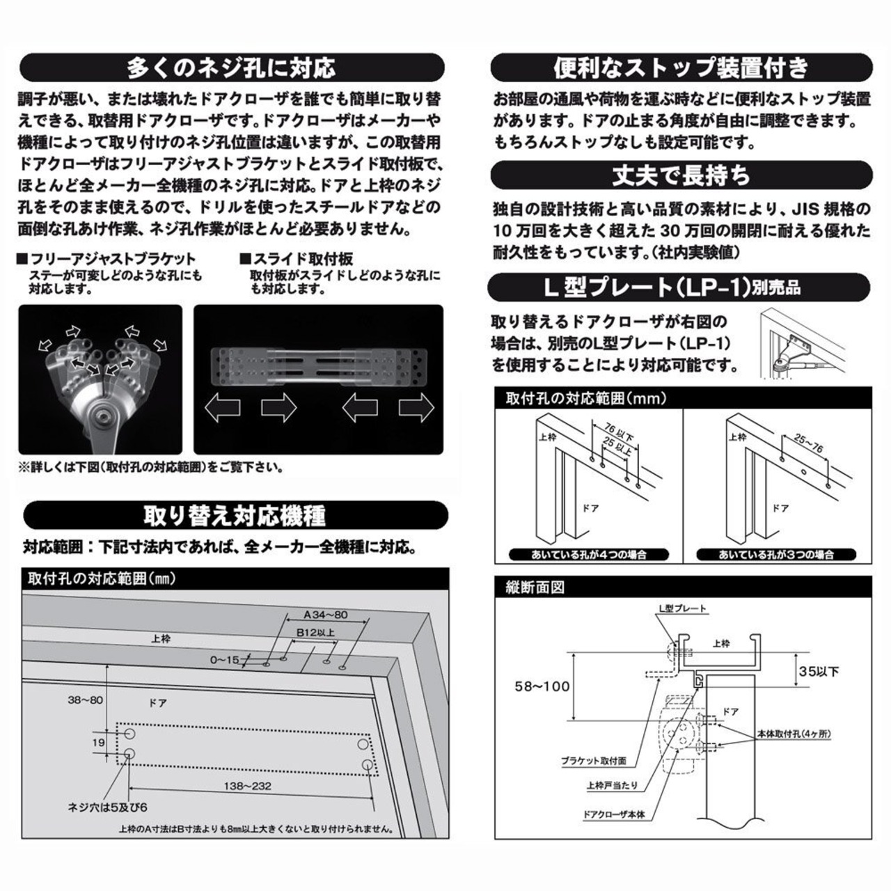 調子が悪い、または壊れたドアクローザを誰でも簡単に取り替えできる、取替用ドアクローザです。