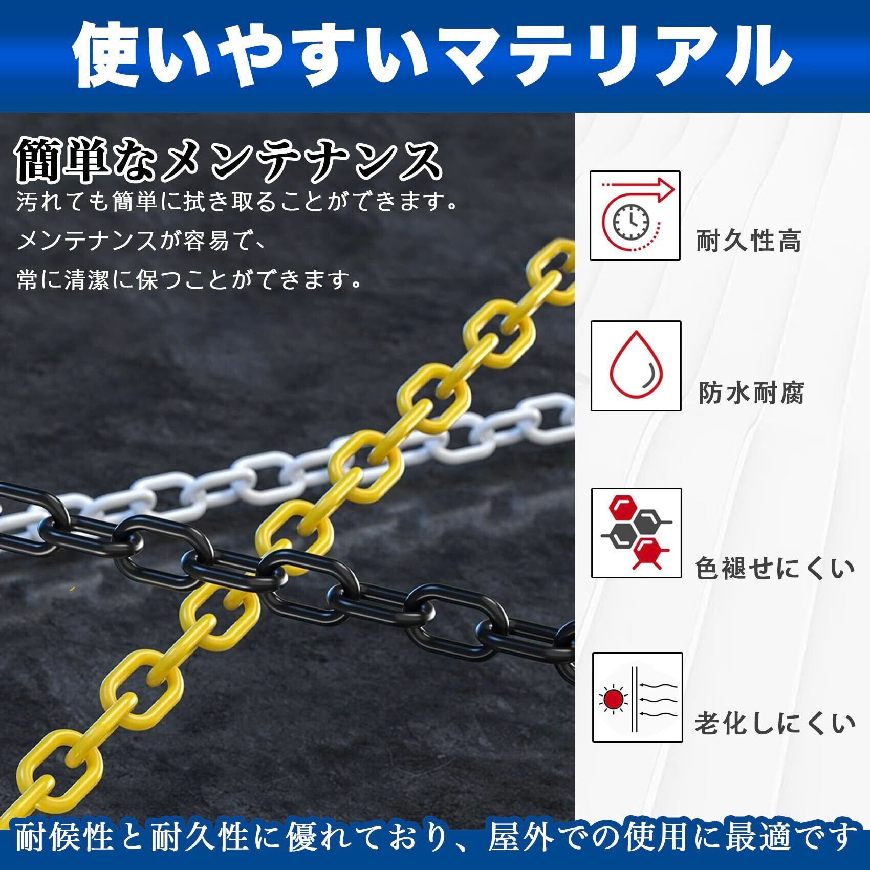 【使い勝手良いチェーン】5メートルの長さがあるため、色々な領域をセパレートしたい時に大変重宝します。お客さまや歩行者の誘導や、立入り禁止、進入禁止箇所など用途に合わせてご利用頂けます。 駐車場、イベント会場、工事現場、学校、遊園地など、さまざまな場所での利用に対応。必要に応じて長さを簡単に調整でき、どんなスペースにも適応します。