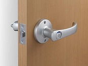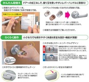 特長:ドアへの加工無しでドライバー1本あれば握り玉ハンドルをレバーハンドルへ取替え可能。開閉がひと目でわかる表示機能付き。施錠機能付き。