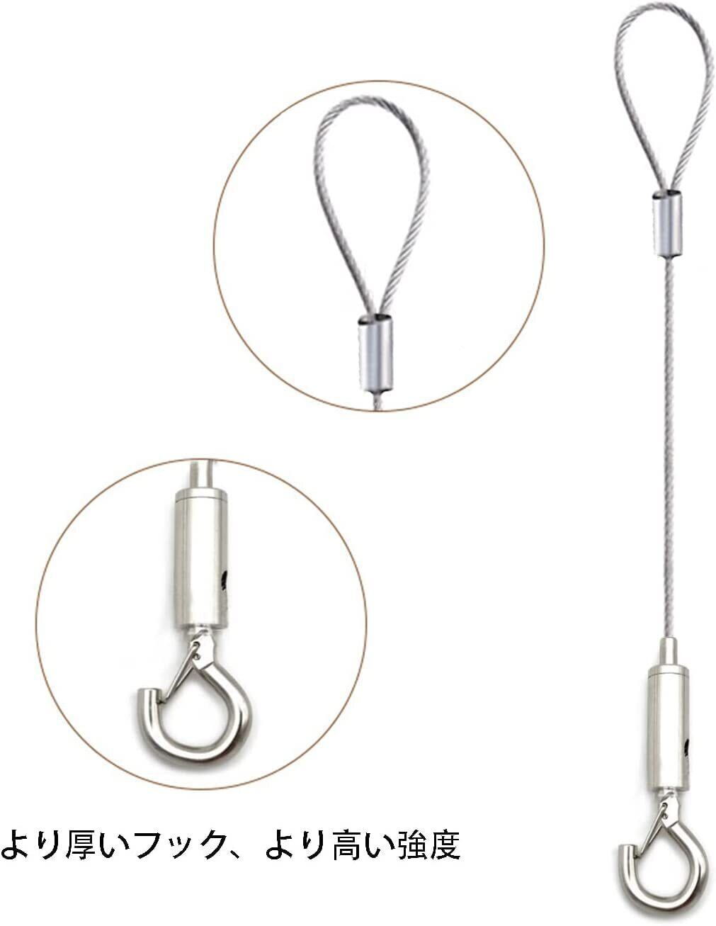 【高品質素材】フック形状の自在金具とワイヤーがセットになった吊下げ金具です。2本セットの安全ワイヤーは、高品質の304ステンレス製で、防水性、防錆性、耐久性に優れています。