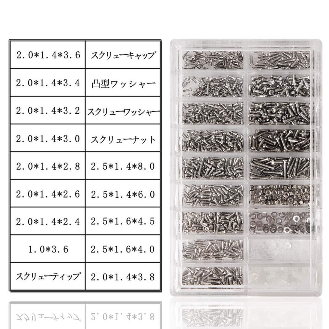 【同梱内容】:1100個小ネジセット(サイズ:2.0*1.4*3.6mm、2.0*1.4*3.4mm、2.0*1.4*3.2㎜、2.0*1.4*3.0㎜、2.0*1.4*2.8㎜、2.0*1.4*2.6㎜、2.0*1.4*2.4㎜、1.0*3.6㎜、2.5*1.4*8.0㎜、2.5*1.4*6.0㎜、2.5*1.6*4.5㎜、2.5*1.6*4㎜、2.0*1.4*3.8㎜)、精密ドライバーセット2本(1.5プラス、1.5マイナス)、精密ピンセット、ミニドライバー。