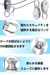 【実用的なデザイン】クレーン滑車装置は一種の巻上げ工具で、綱車とも呼ばれ、車軸での車輪またはその周囲に2つのフランジの間で溝のある軸で構成された機構です。ユニークな360度回転設計により、ロープの結び目を防ぎ、使いやすい, 滑らかなロープ滑車が優れたロープトラバースを実現。
