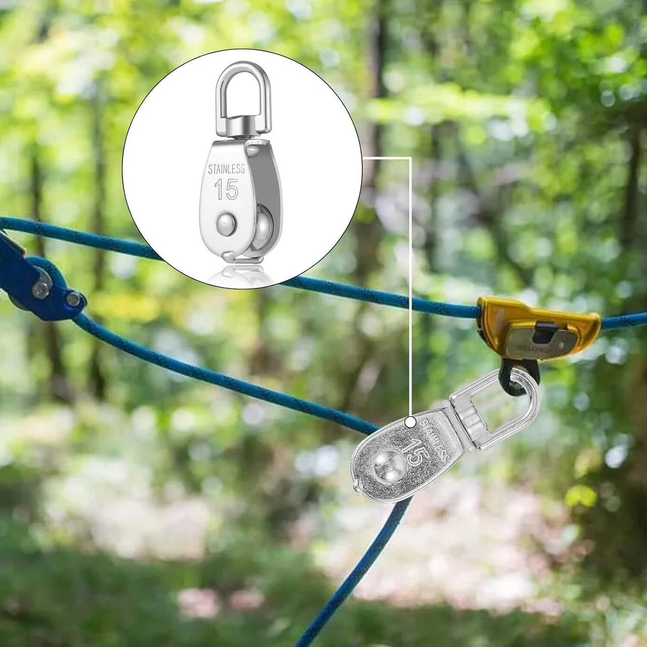 【360度回転】ユニークな360度回転設計は、ロープの結び目を防止し、使いやすく、滑らかなローププーリーは、優れたロープのトラバースを提供します。