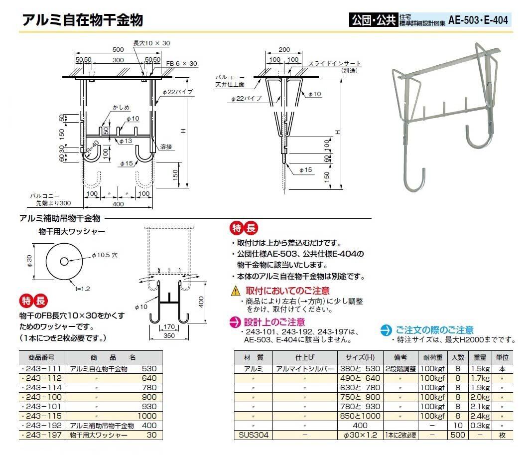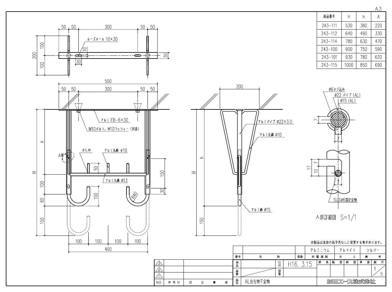 アルミ製自在物干のロングセラー。 取付は300mm間隔の10×30取付用長穴を利用してボルトナット等で取付けます。