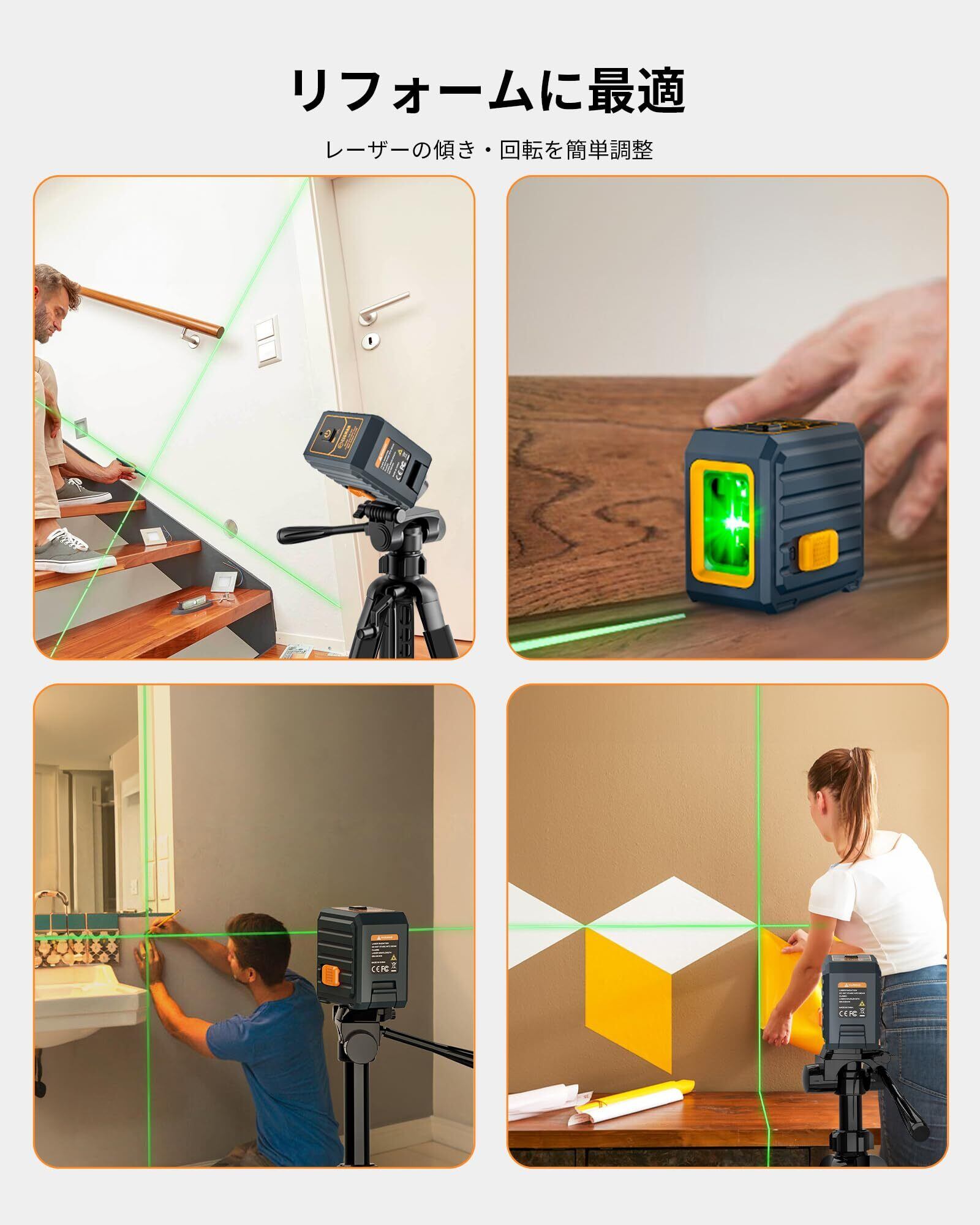 初心者に最適:墨出しレーザーはシンプルな設計で、ボタン1つとスライドキー1つのみの操作が可能です。手に取ってすぐに使い方がわかります。レーザーは緑色の光線を採用しており、赤色に比べてより明るく見やすくなっています。DIYでの使用に最適で、絵の取り付けやタイル張り、キャビネットの設置など、さまざまな場面で活躍します。IP54の防塵・防水構造がホコリの多い現場、急な雨でも安心です。