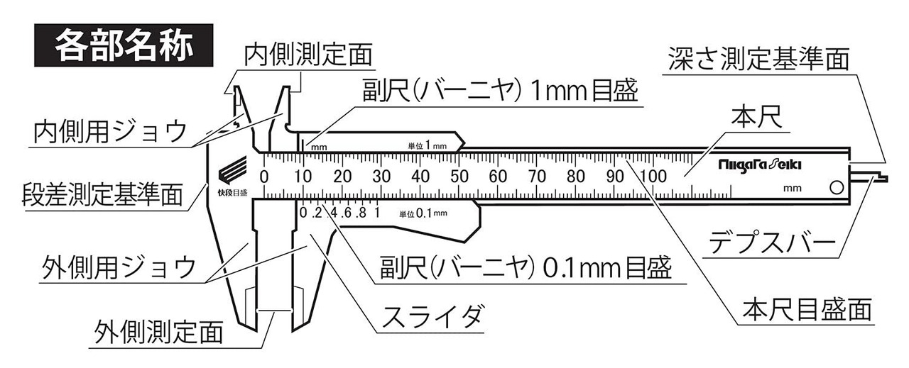 ・本尺は1mm単位の目盛が見やすい段差型目盛