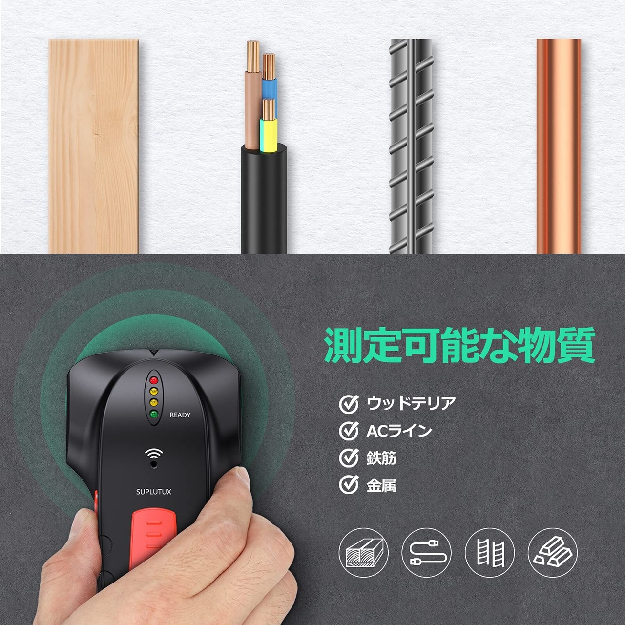 【なぜ壁裏センサーが必要でしょうか?】日本の住宅の壁は9割が「間柱」などの下地に石膏ボードを取り付けて作られています。石膏ボードはもろくて崩れやすいので、ネジなどを壁に打ち込むの前に、石膏ボードの裏にある下地材を探す必要があります。SuplutuX壁裏探知器は検出深度は3/4インチで、主に壁裏の木材を探知し、また金属やAC電線大体の検出範囲を測定して安全に避けて、ネジなどを木材の中部に入れます。