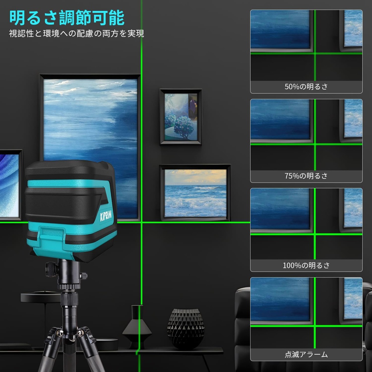 Kiprim レーザー墨出し器 墨出しレーザー 視認性向上、明るさ調整可能、手動/自動水平/パルスモード、レーザー安全基準:クラス2 電池とキャリングポーチ付属 日本語説明書付き LV8