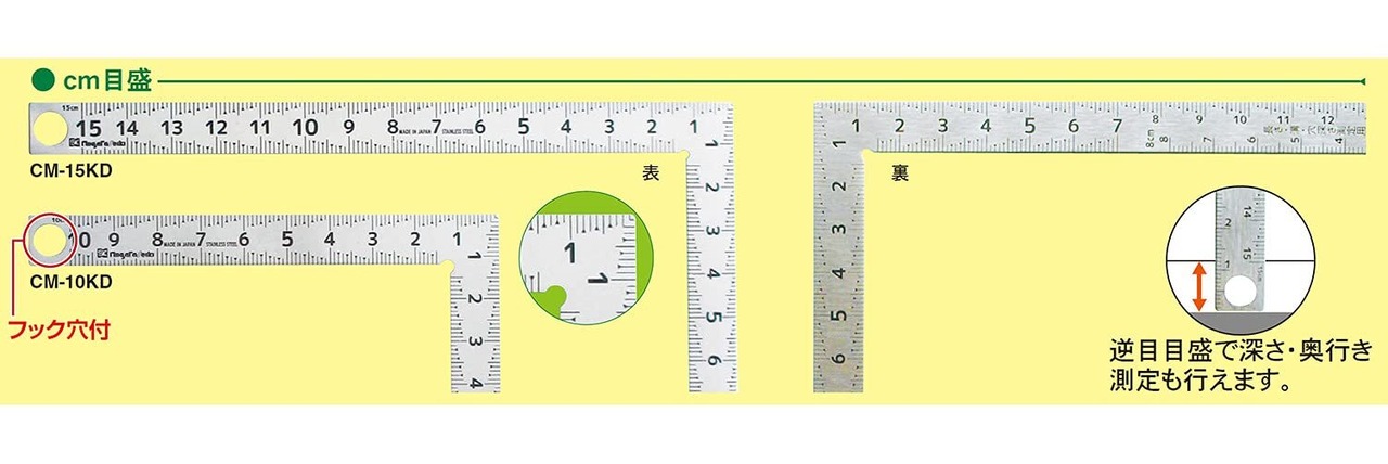 深さ測定に便利な逆目目盛付(裏面)です。