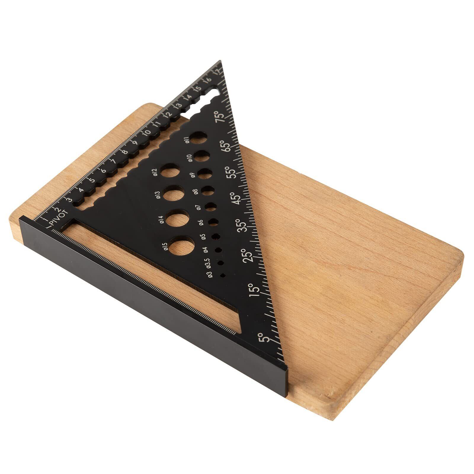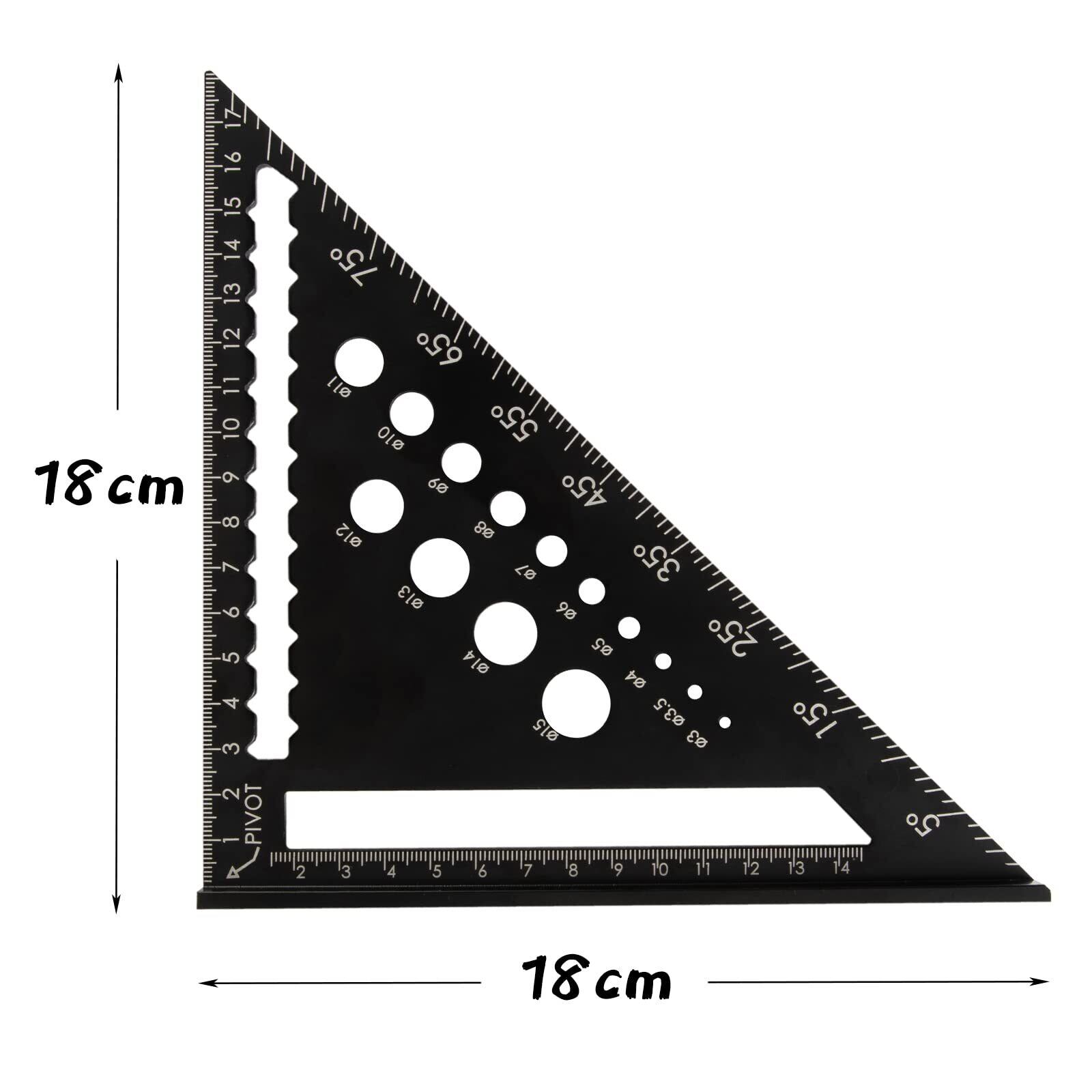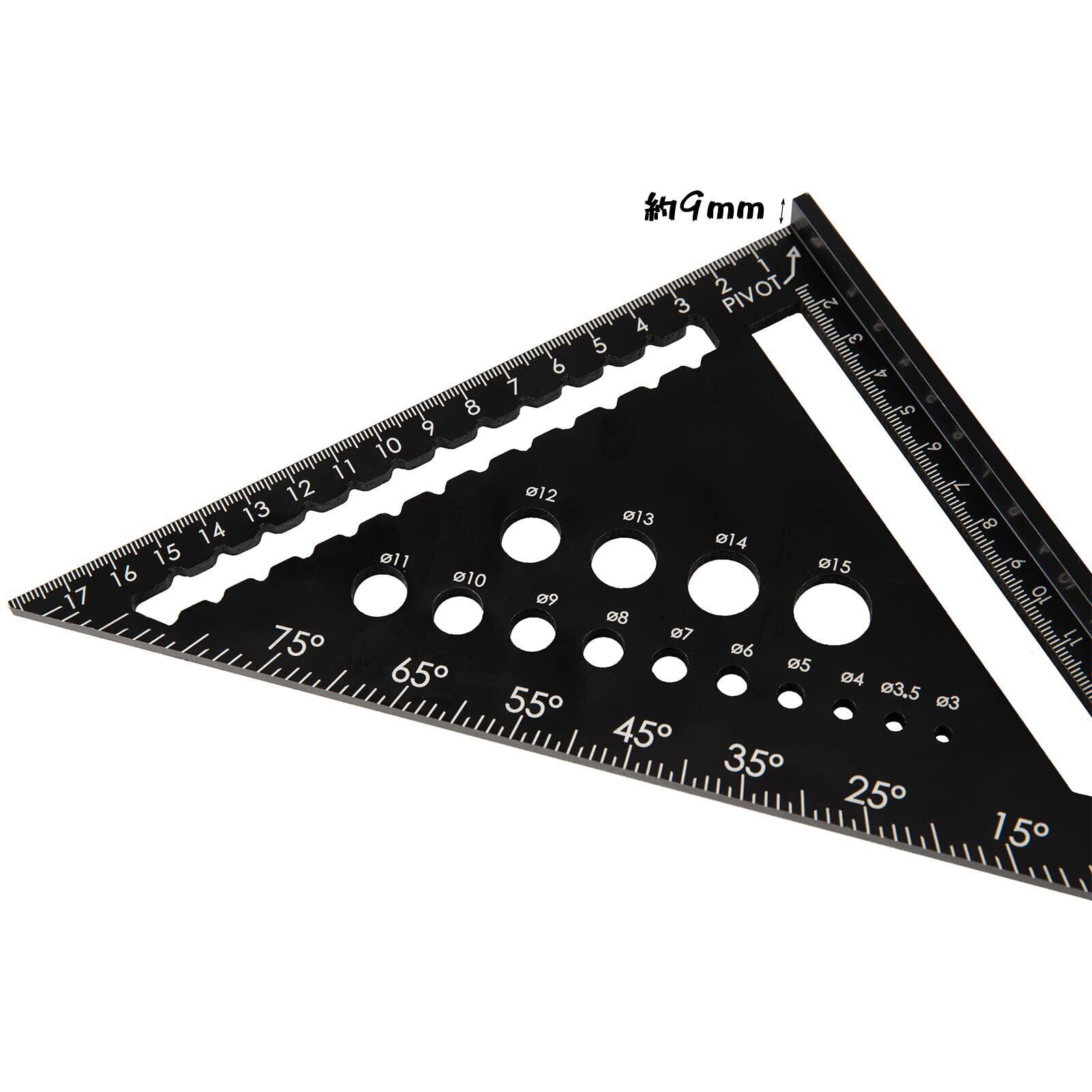 18cm以内の長さ測定のほか、直線、角度や丸形も描けます。直径3mmから15mmまで14個の穴があり、穴あけるとき、ドリルガイドとしても使用可能です。