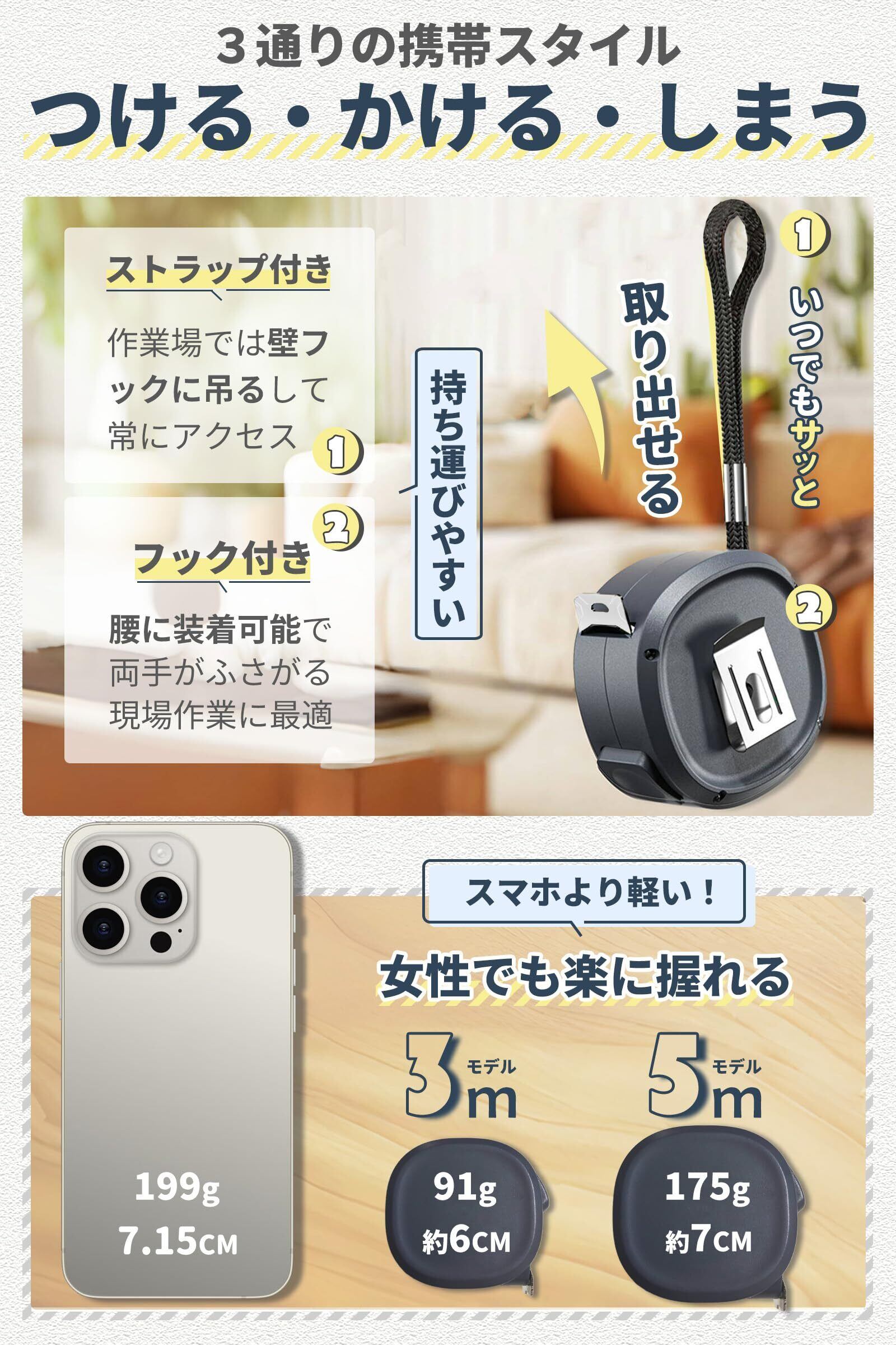 【持ち運びやすい】スマホより軽い!女性でも楽に握れる小型設計!【3mモデル】直径約6cm、約91g【5mモデル】直径約6cm、約175g。カバンやポケットに入れて、いつでもどこでもサッと測定可能です