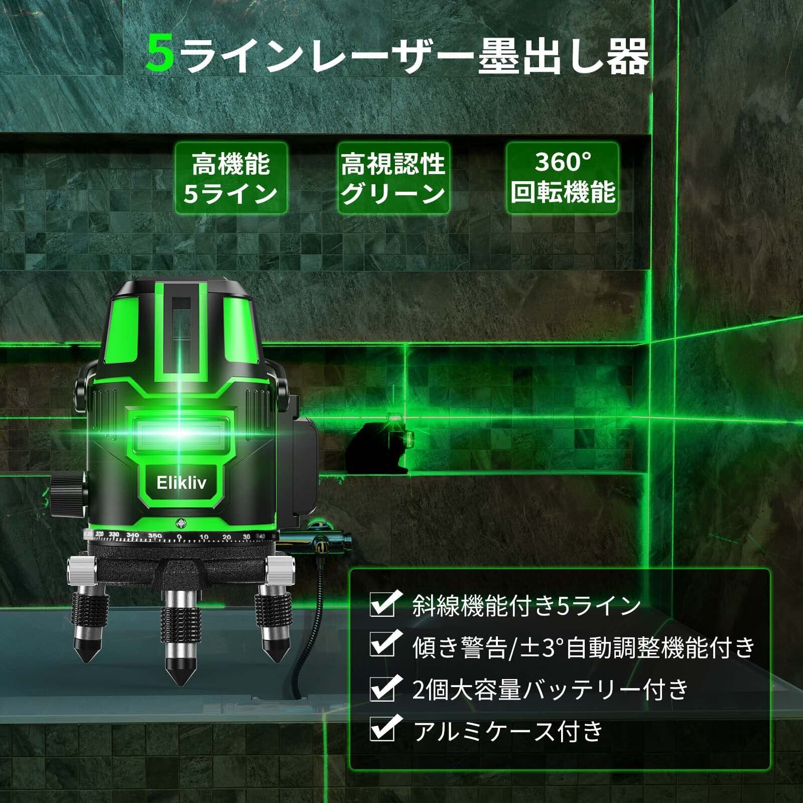 Elikliv レーザー墨出し器 レーザー 水平器 レーザー レベル グリーン 5ライン 4方向大矩照射 360°微調整 大容量バッテリー2個 高輝度 高出力 自動補正 軽天作業 測量建築 DIY 軽量 小型 屋内屋外 アルミケース付き 型番:B5