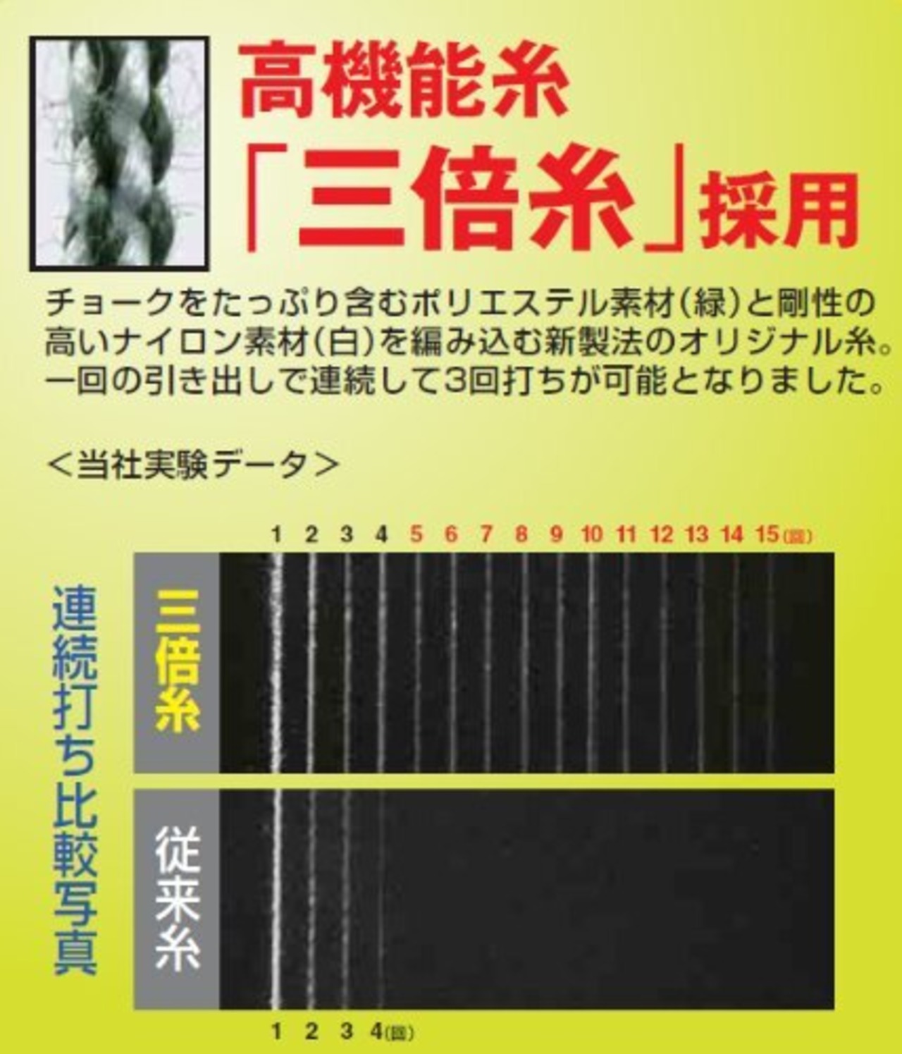 従来の3倍以上(TJMデザイン社比)の粉チョークを吸着する高機能糸「三倍糸」採用。