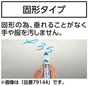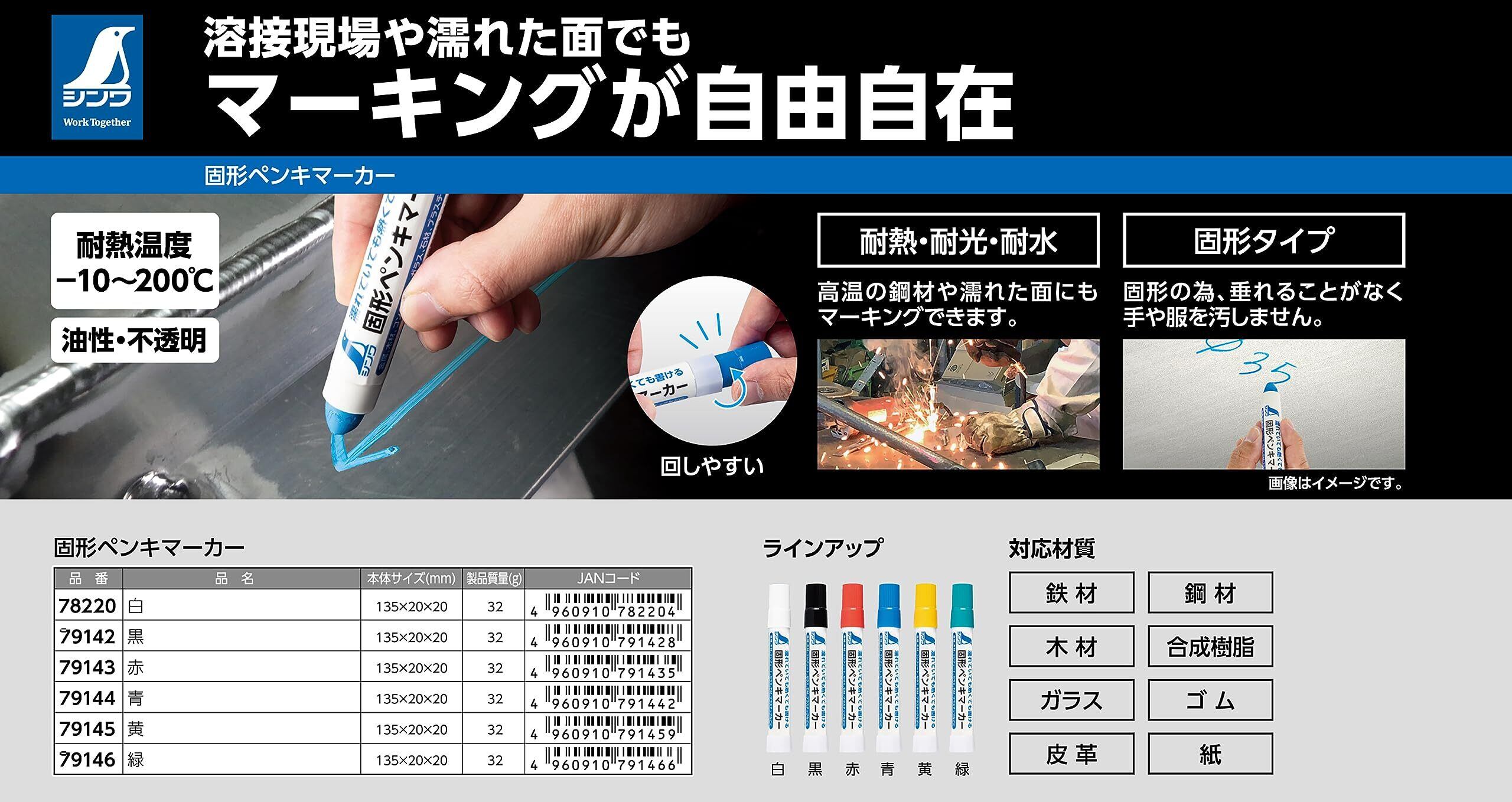 ●耐熱・耐光・耐水。●油性・不透明。●固形のため、垂れることがなく手や服を汚しません。●高温の鉄材や鋼材、クレヨンやチョークではマークしづらいガラス、ゴムへのマークに。●濡れた面でもマーキング可能なため、屋外で使用する鉄材や鋼材へのマークに。●自動車、トタン、建材、サッシ、門扉、フェンスなどの塗装剥離部分の補修にも手軽に使えます。