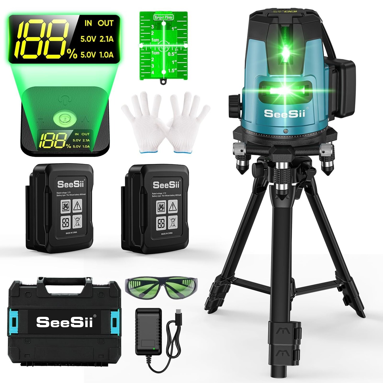 【2025最新改良】SEESII レーザー墨出し器 グリーンレーザー 5ライン 電量LCDディスプレー搭載 水平器レーザー 墨出し器 5線6点 レーザーレベル 三脚 屋外 回転レーザー線 高輝度 高出力 軽量作業 タイルの張替え 建設 建築 DIY 2個大容量バッテリー エレベーター三脚 収納箱付き 型番L5-B2-Pro