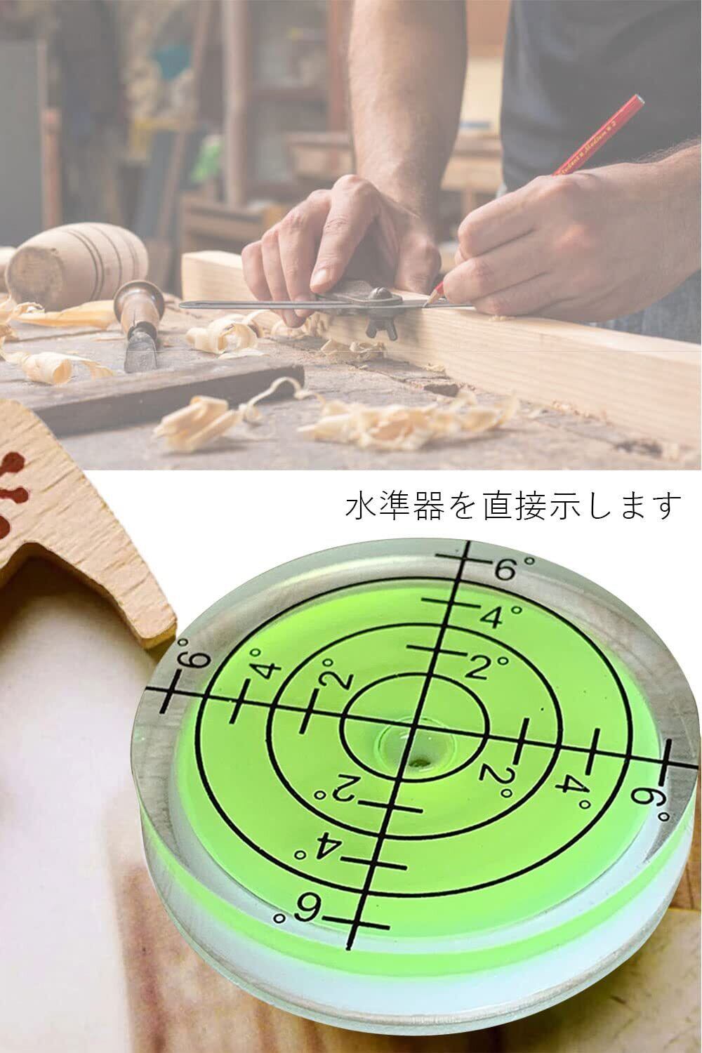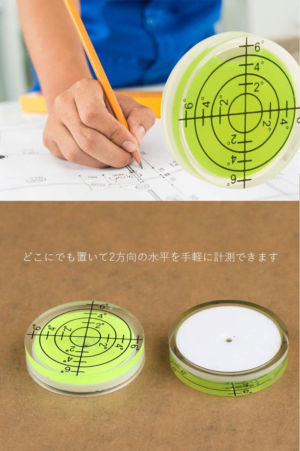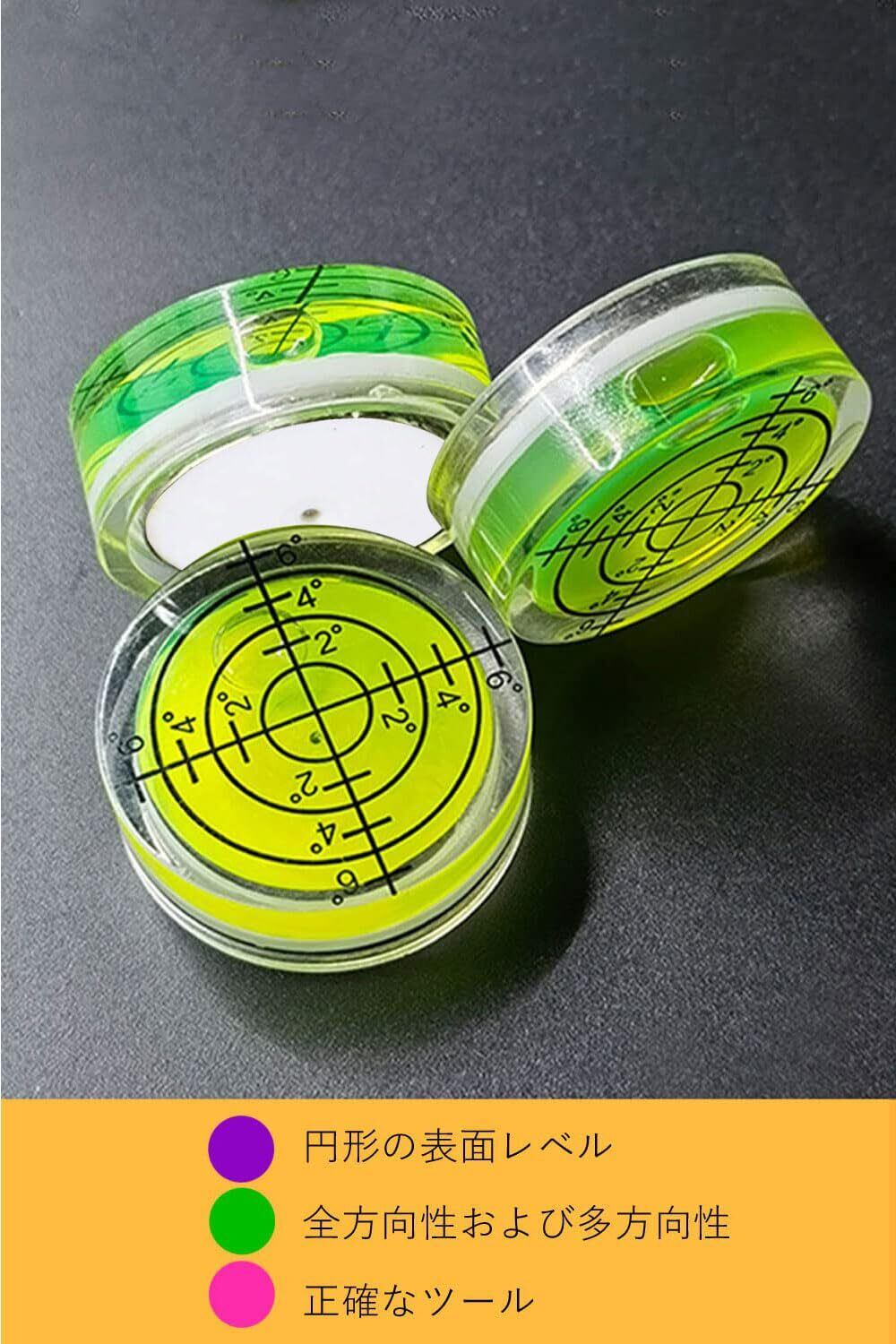 【幅広い用途】円形水準器は、レベリングカメラ、三脚スタンド、ステレオターンテーブル、レコードプレーヤー、スピーカー、グラモフォン、望遠鏡、RV、キャンピングカー、トラベルトレーラー、家具の配置、3Dプリンター、事務機器、建設、大工道具、大工調査、工場機械などは、水平位置の迅速な修正を示します。