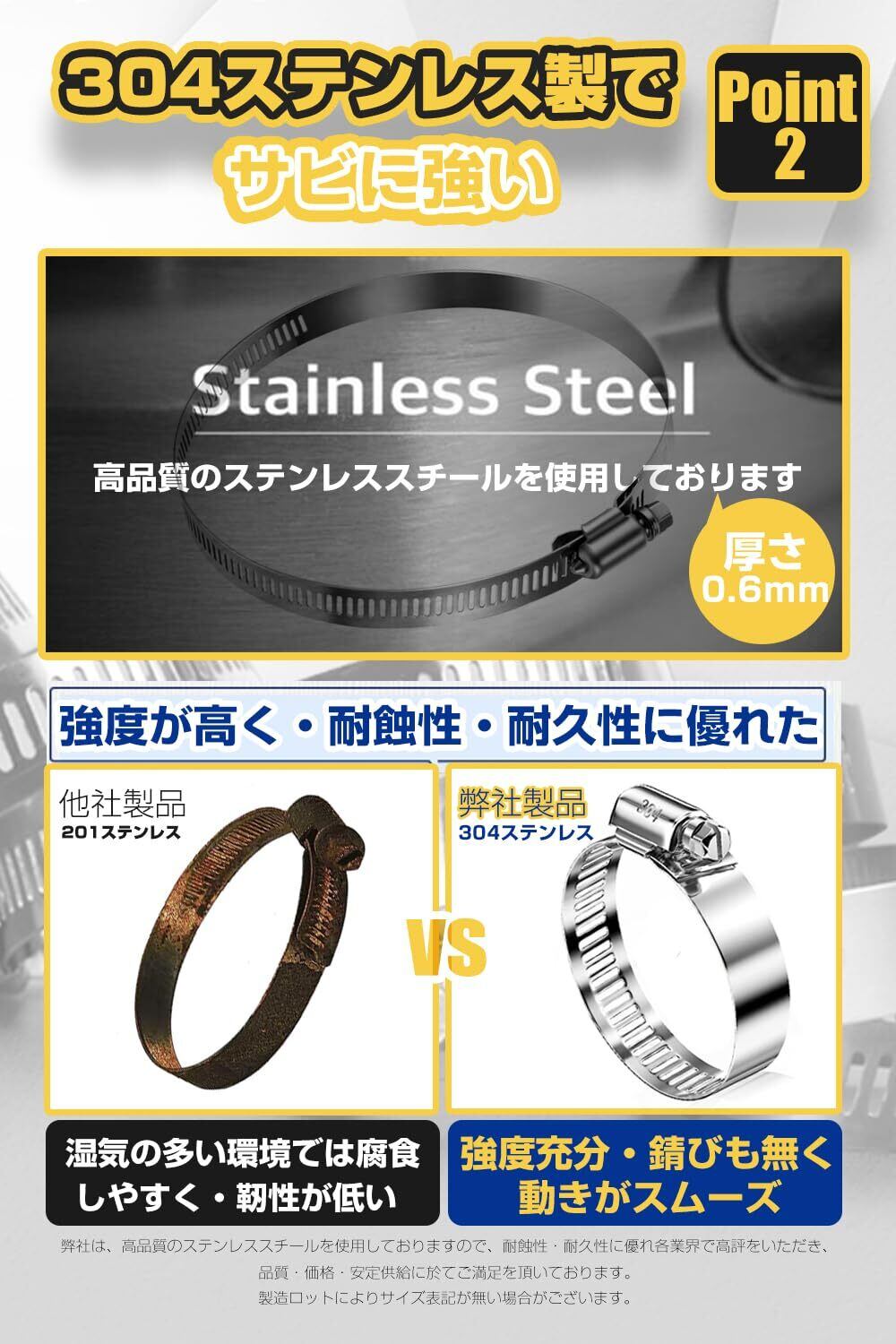 【304ステンレス鋼】ホースバンドは304ステンレス鋼で作られていて、高耐久性・耐候性に優れています。また、高温、低温ともに耐熱性と強度があります。【材質について】 本商品はビス部分もSUS304です。