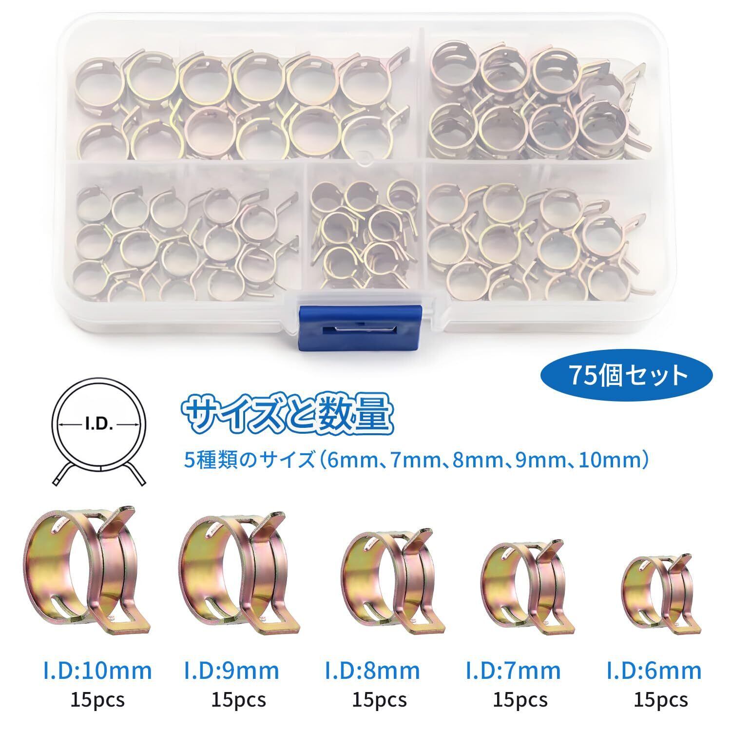 ホースクリップ オイルパイプクランプ 75個セット 6-10mm 強力亜鉛メッキ スプリングクランプ 多サイズ対応 錆ない 金属鋼製 固定用 簡易取り付け 収納ケース付き