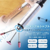「すべてのアクセサリー」ホイール×3(布ホイール、砥石、ファイバーホイール)、ドリルチャック×1、フレキシブルシャフト× 1、シャンク付