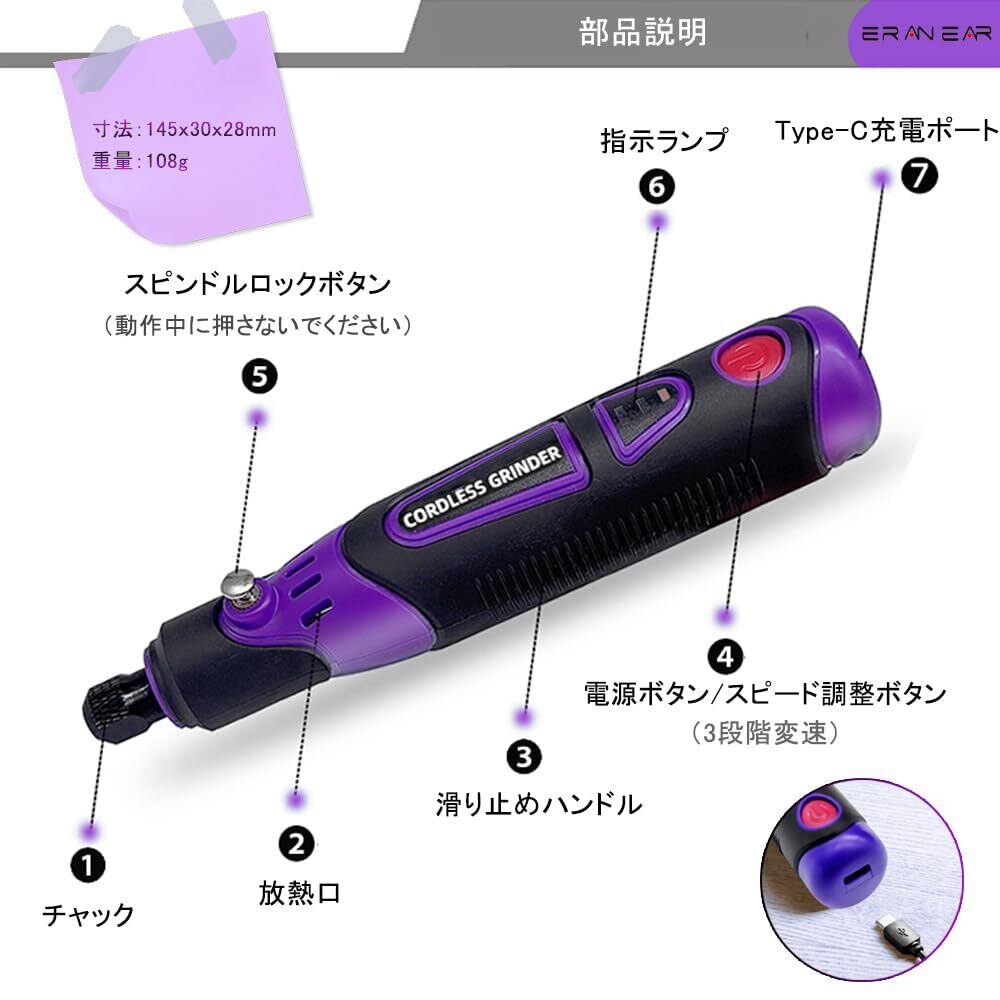 【人間工学設計】ミニルーターは人間工学に基づき、細身で持ちやすいように設計されており、長時間持っていても手が疲れにくい、細かい動きや不便なところでも処理ができる優れものです。ペン型のコンパクトなサイズ(145*30*28mm)、わずか108g軽量の設計で、どこにでも持ち運ぶことができます。