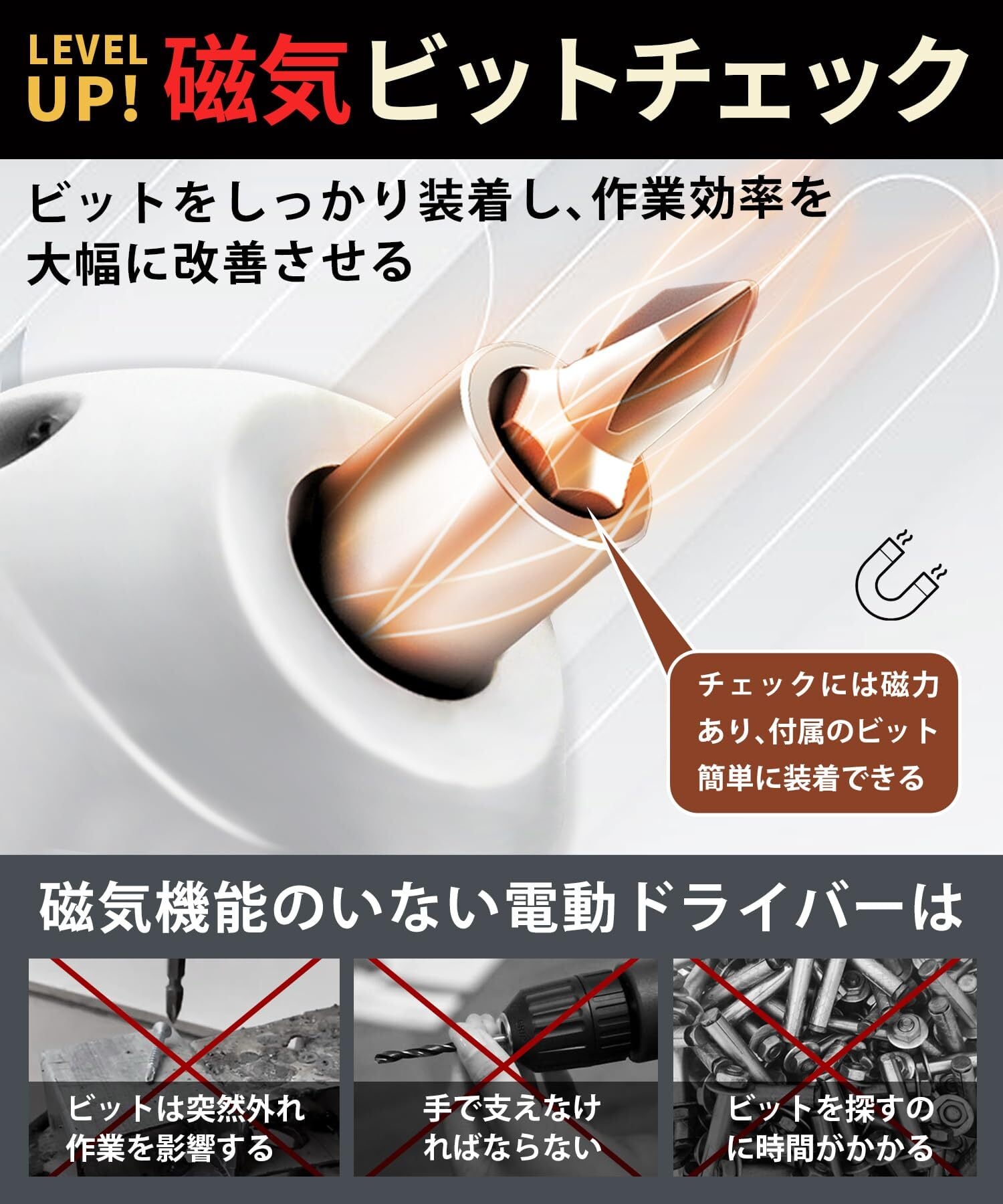 【マグネットビットホルダー】:この電気ドリルセットには、付属の10個のビットを所定の位置にしっかりと保持するマグネットチャックが付属しています。この便利な機能により、作業中にビットを紛失することがなくなり、作業効率と生産性が向上します