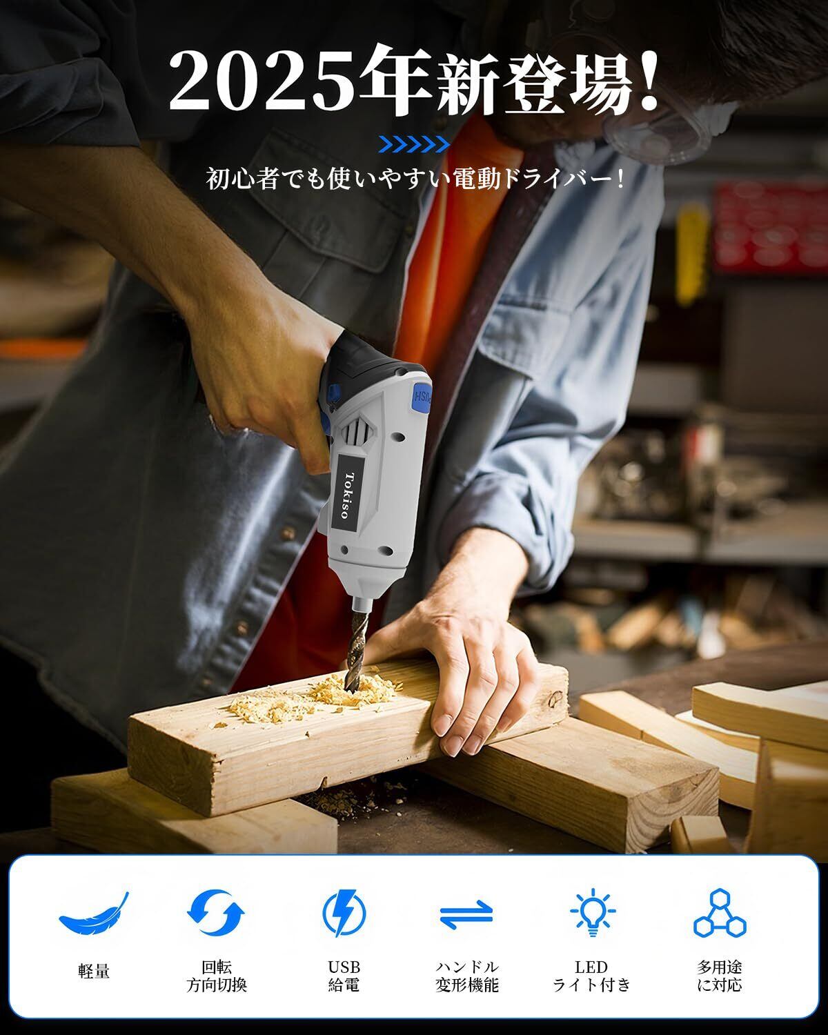 【初心者に最適!軽量・コードレス設計】組み立てやDIY家具などの作業を格段にアップされる人気小型電動ドライバー、ボタンを押すだけねじを締めたり緩めたりすることができます。本体は約287.4gの軽量設計、また、コードレスや小型といった特徴があります。女性、老人 でも手軽に使えるサイズ感。