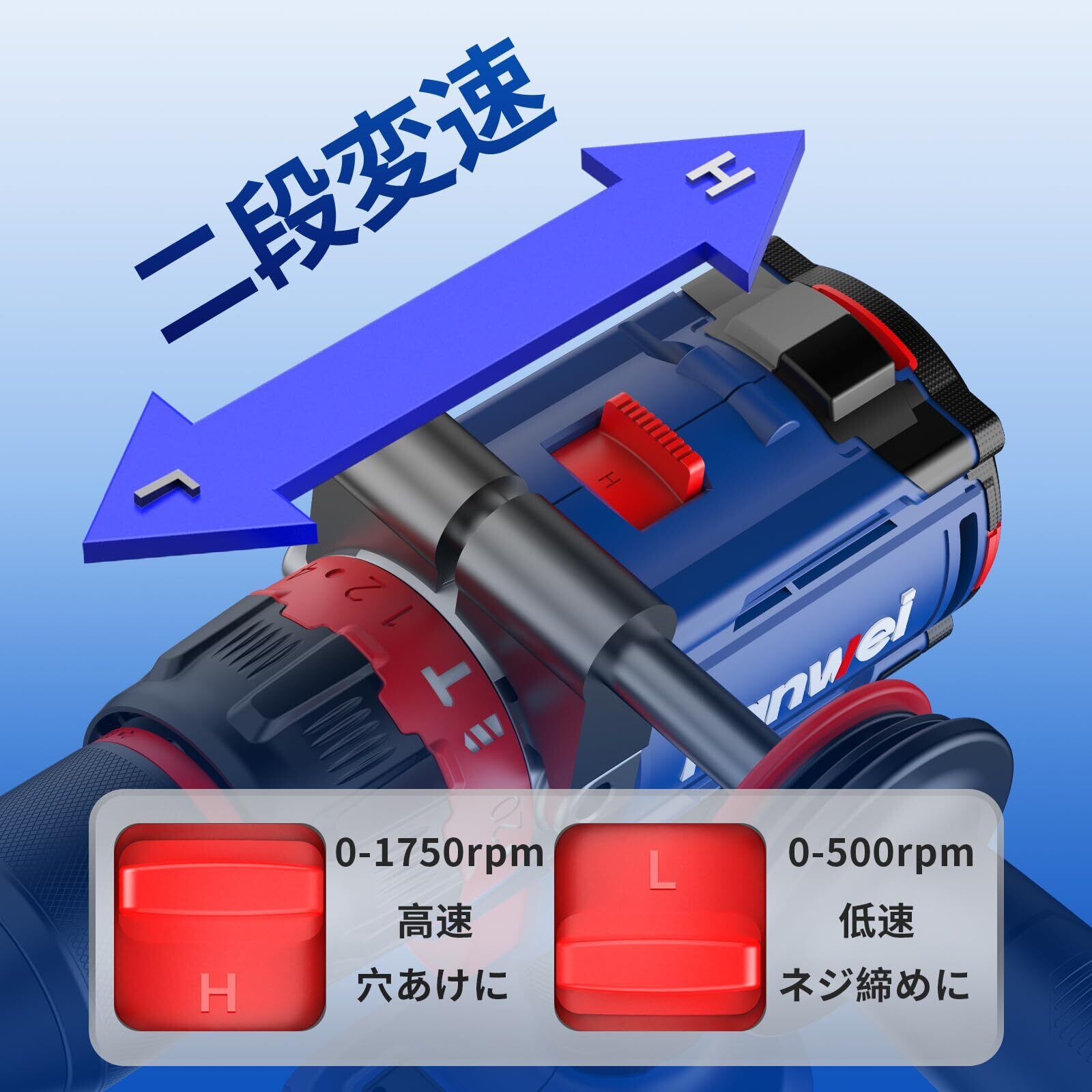 【2段変速&無段変速】高速1750rpmと低速500rpmの2段変速を切り替えできます。高速モードは穴あけなどの重作業に適し、低速モードは小径のネジ締めなどに最適です。また、スイッチの押し加減で回転速度を微調整できる無段変速機能も搭載しています。