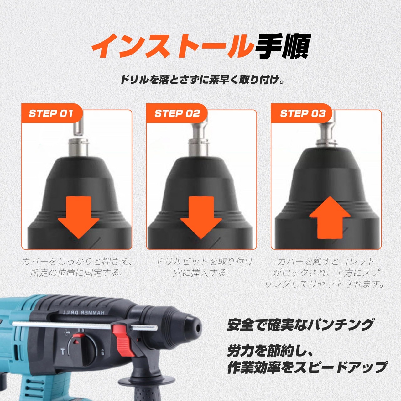 【強力・耐久性の高いブラシレスモーター】ブラシレスモーターは、カーボンブラシを使用しないため、回転数0~1400r/min、打撃数0~4550回/minのパワフルなBLモーターをより低温でより効率的に稼働できます。最大穴あけ能力は、コンクリート24mm、鉄工13mm、木工27mmです。