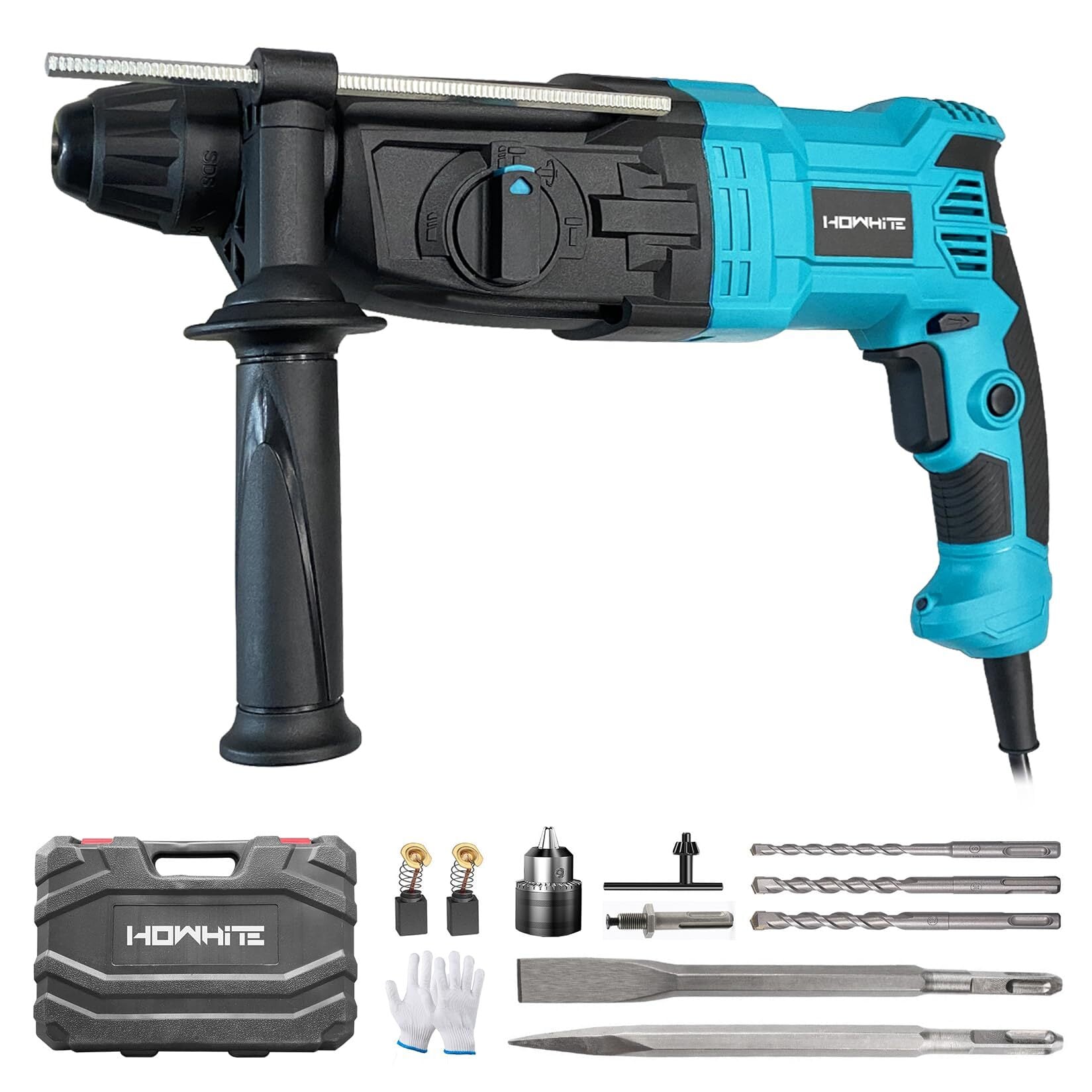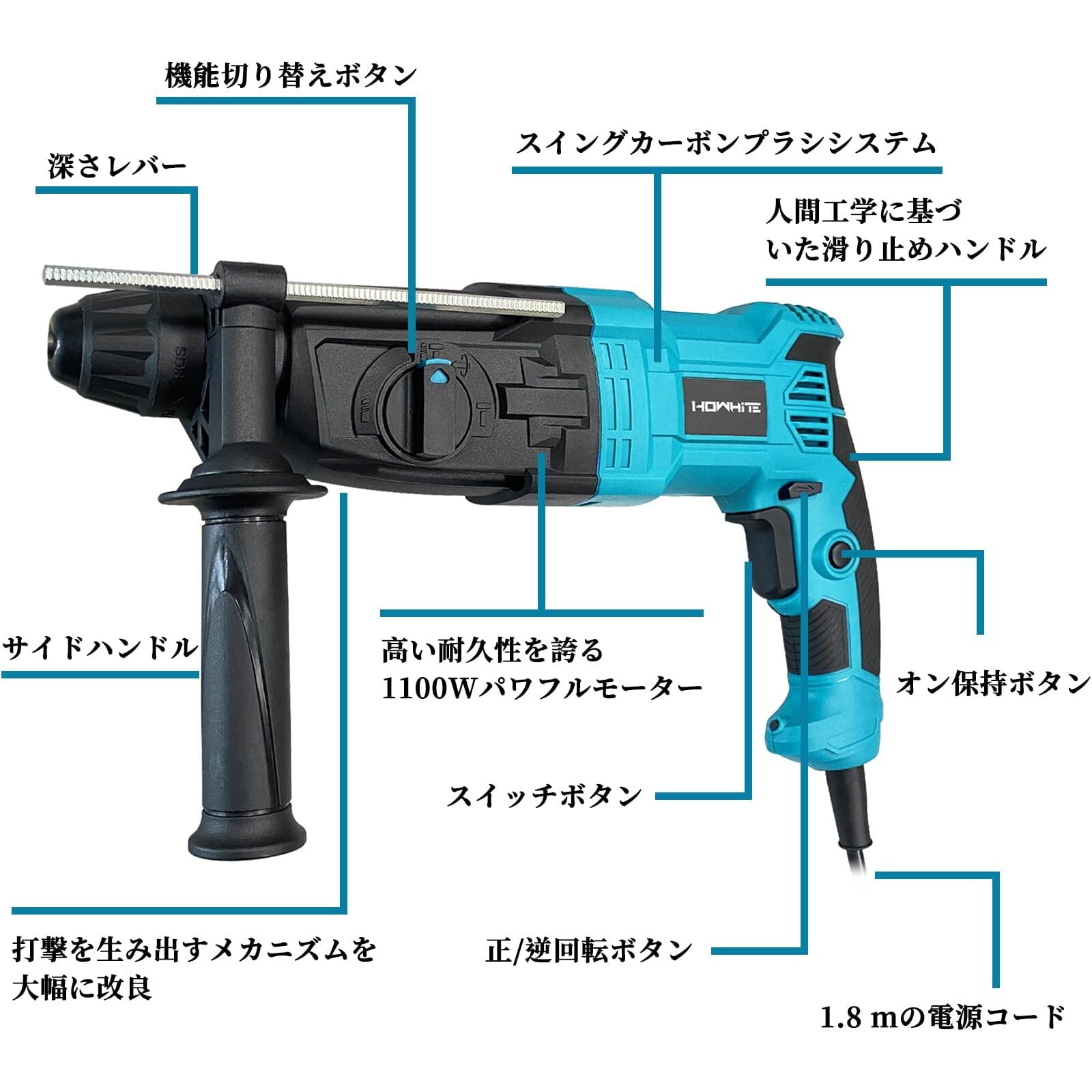 Howhite SDSプラスハンマードリル 110V 1100W ハンマードリル 電動ハンマー 無段階変速 3モード切替 軽量 低振動 コード式 ハツリ 穴あけ コンクリート26mm/鉄工13mm/木工40mm 収納ケース付き 日本語取扱説明書付き | Bloomia