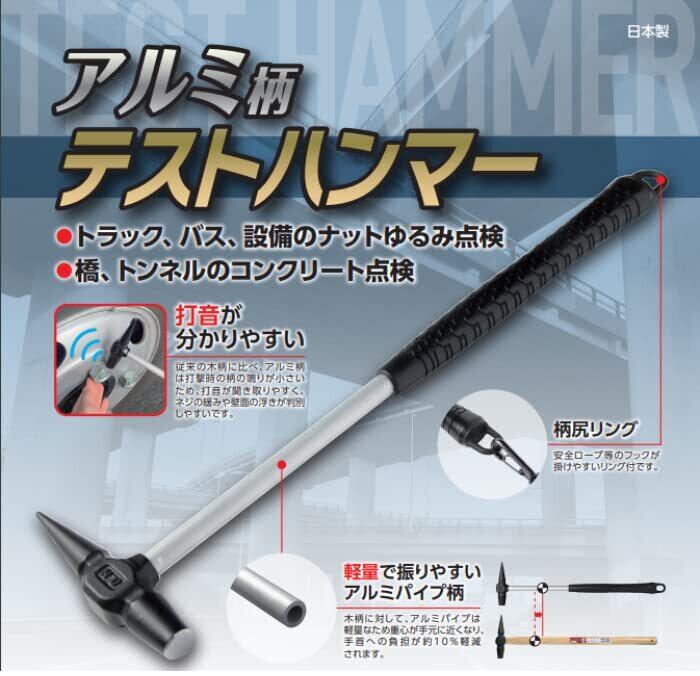打音が分かりやすい!従来の木柄に比べアルミ柄は打撃時の柄の鳴りが小さいため、打音が聞き取りやすくネジの緩みや壁面の浮きが判別しやすい