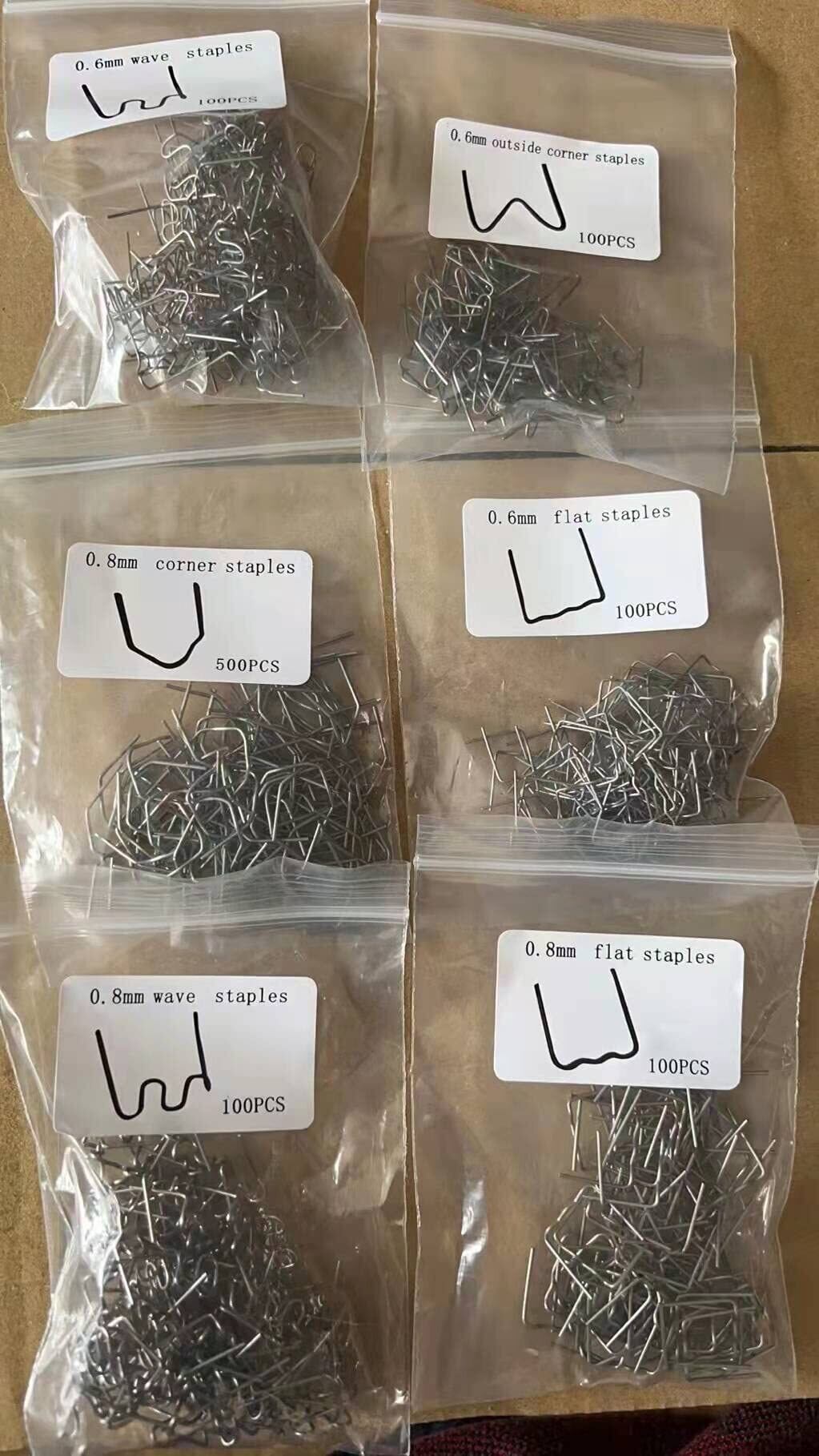 【6種類 600個】電熱ピンキットには6つの形があり、合計600個あります。S形(0.6mm)*100、S形(0.8mm)*100、波形(0.6mm)*100、波形(0.8mm)*100、W形(0.6mm)*100、V形(0.8mm)*100。量もバラエティも豊富で、さまざまな仕事に対応できます。