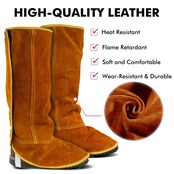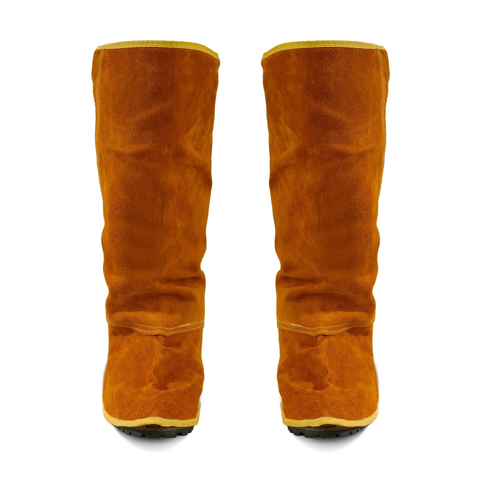 【プレミアムプロテクション】安全で効果的なエクストラロング牛革溶接靴カバー。フルカバータイプのスパッツは、作業中に高価な靴を保護し、足もしっかり保護します。もう足を焼くことはありません!