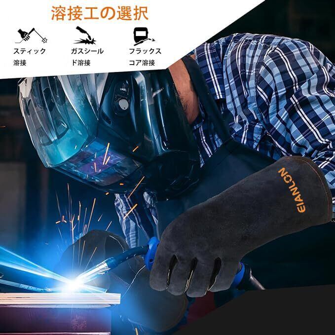 【優れた耐火性と耐熱性】外装は高級耐火性レザー、柔らかく難燃性コットンライナーで作られており、翼の親指にはダブルレザーで強化されたパッドが付いています。この優れたデザインにより、EIANLON 溶接手袋は 500℃ までの耐火性と耐熱性を備えています。