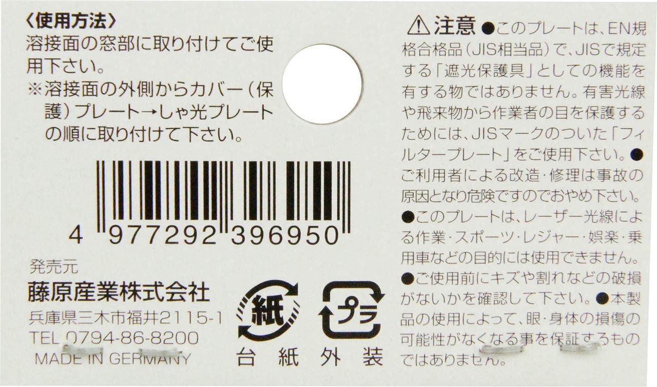 ※このプレートは、EN規格合格品(JIS相当品)で、JISで規定する遮光保護具としての機能を有するものではありません。