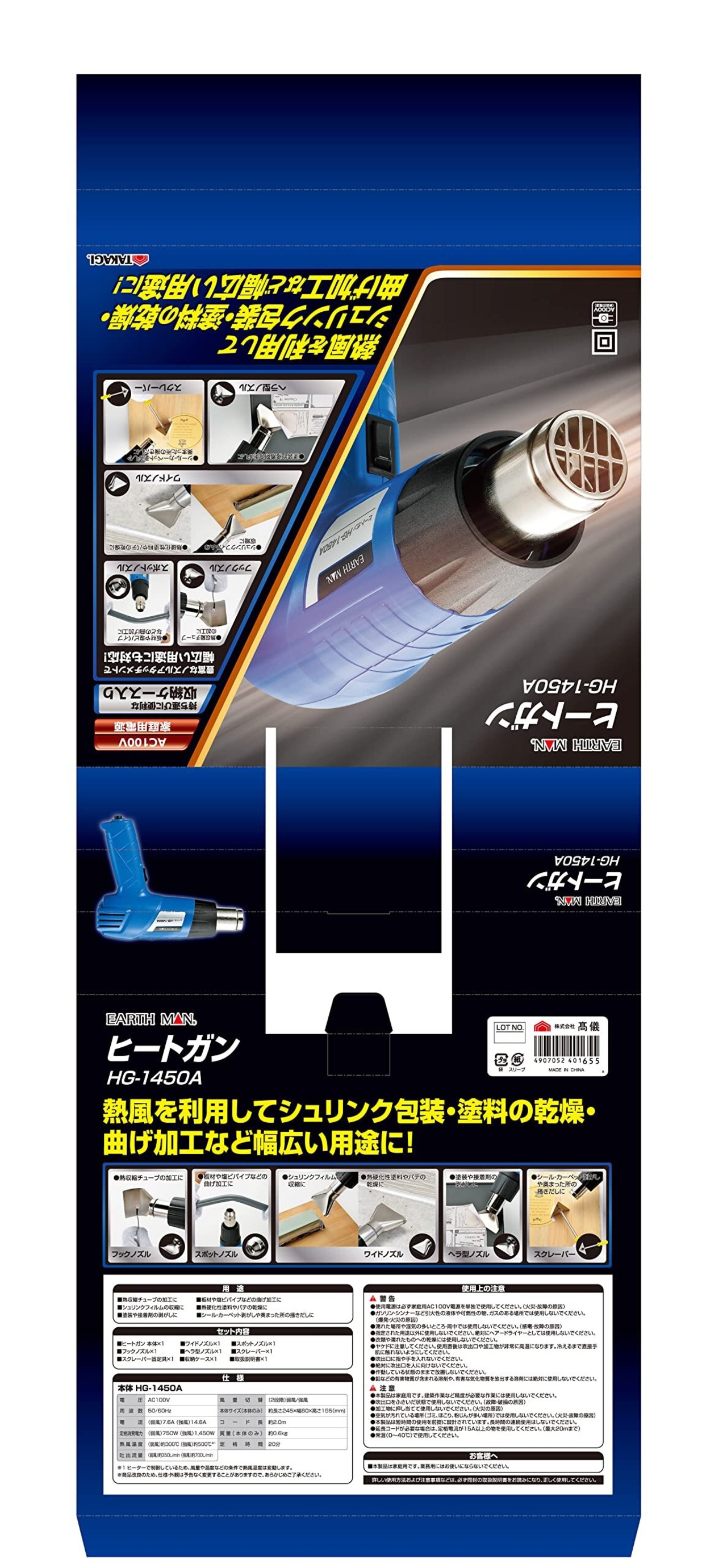 高儀(Takagi) ヒートガン EARTH MAN 小型 HG-1450A【豊富なアタッチメント付属】【温度や風量調整可能】【シュリンク包装、塗料乾燥、曲げ加工、カーフィルム施工など】