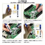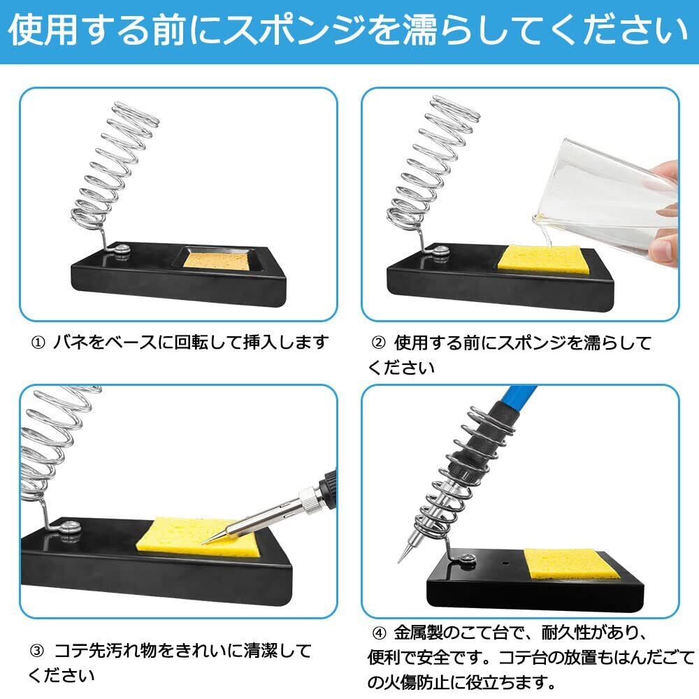 セット内容:はんだごて本体x1、こて台x1、はんだ吸い取り器x1、交換用こて先x5、半田ワイャーx1、静電気防止ピンx2、日本語取説X1、収納ケース付けの13点セットです。注意: ①こて先を交換する際、外しにくい場合は手袋をして摩擦を大きくするとよいです。②スポンジはやや大きめで、必要に応じて切り取ることができる。