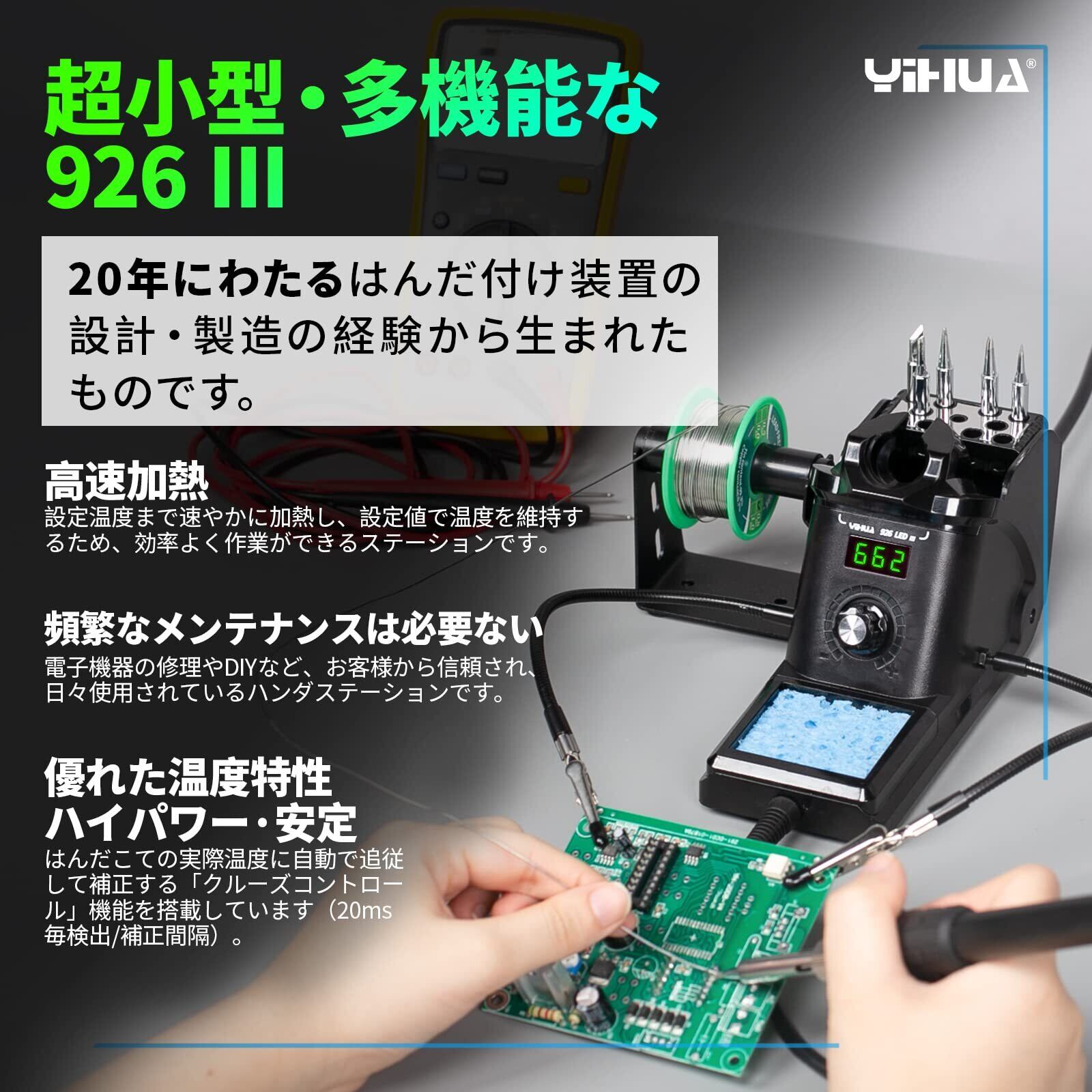 YIHUA 926LED III はんだこてセット 2つの調整可能なアーム付き デジタル表示 温度制御型90°C~480°C °C/ºF表示 スリープモード アジャストモード 5xこて先 1x鉛フリーはんだ 1 x はんだリール台 1 x はんだ吸取器 1 x ピンセット 1 x スパナ 1 x クリーニングスポンジ 1x日本語取扱説明書 コンパクトはんだごて | Bloomia