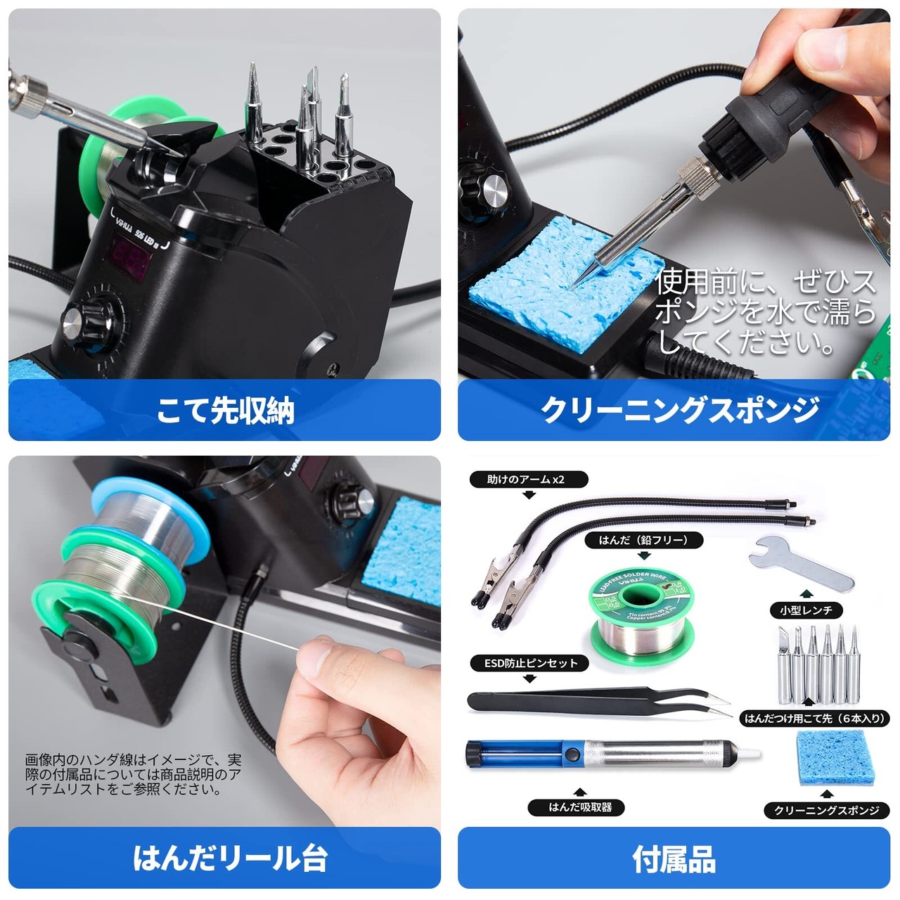 「14種類アクセサリー付き」2xアーム、5x異なるこて先、1x鉛フリーはんだ(35g)、1xはんだリール台、1xピンセット、1xはんだ吸取器、1xクリーニングスポンジ、1x日本語取扱説明書、1xスパナ(アームを外す用) 。