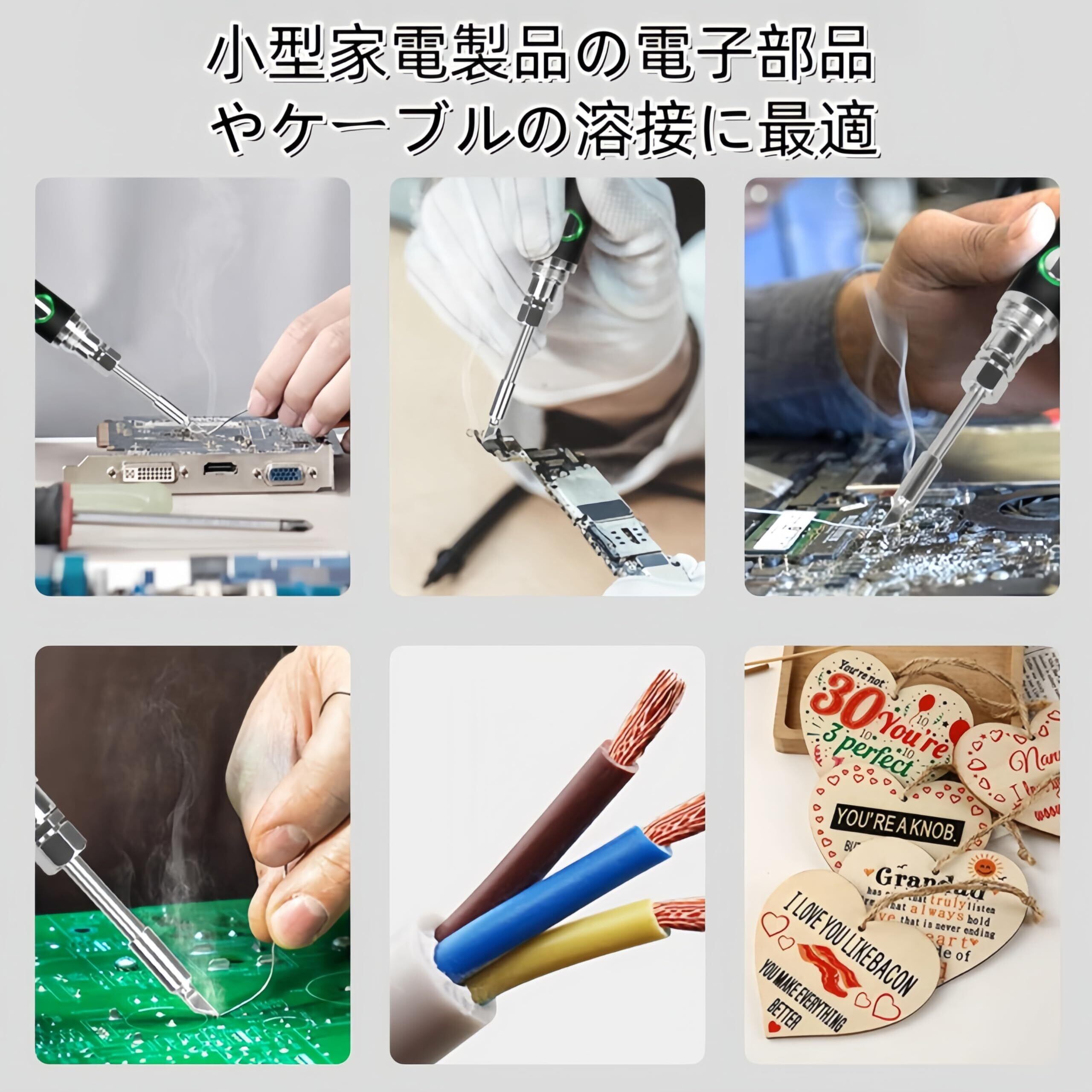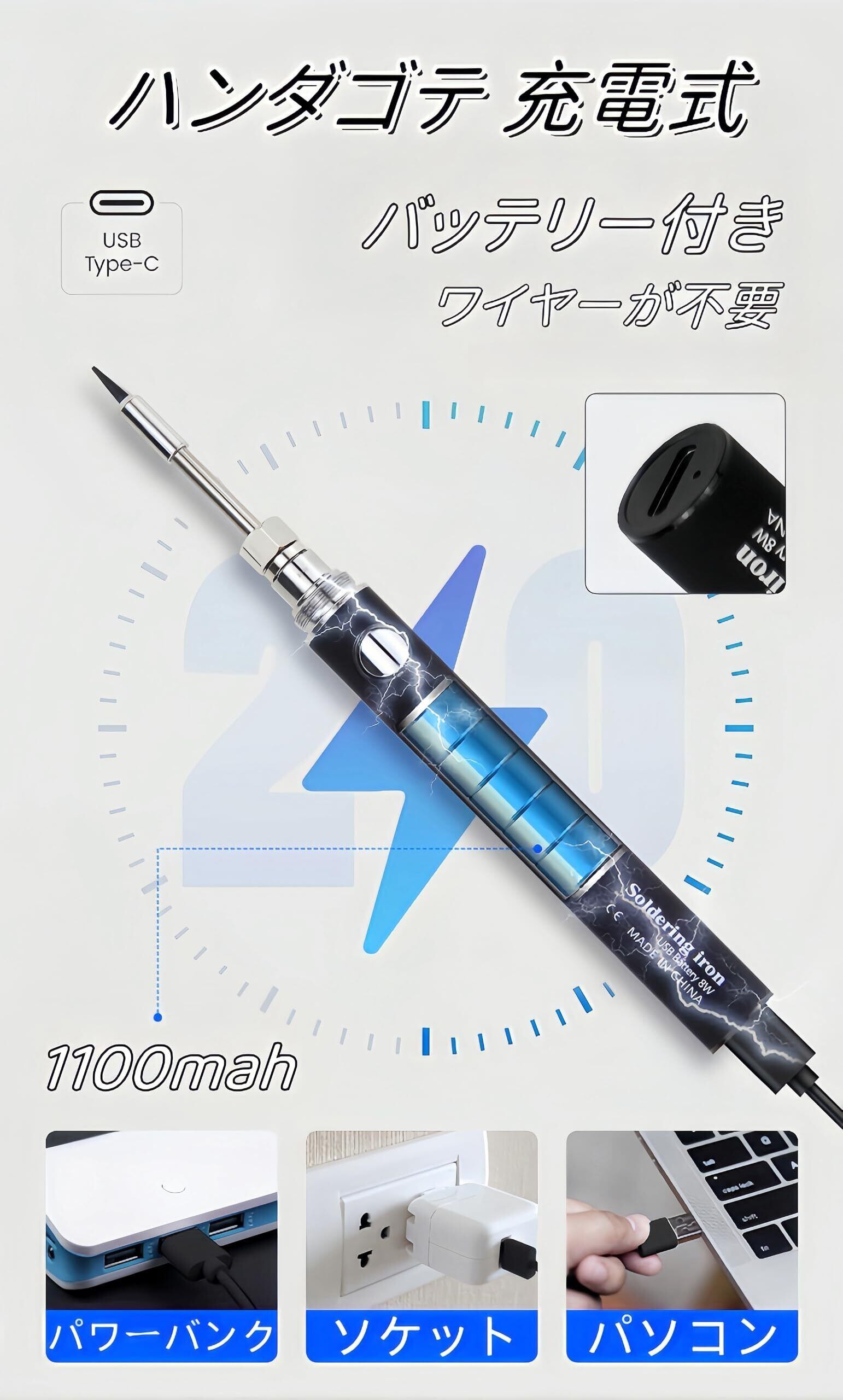 【ハンダゴテキット】1×コードレスはんだごて、3×はんだごてチップ、1×ベース1×はんだ線、1×type-c充電ケーブル、注: コードレス溶接は大規模プロジェクトには適していません。