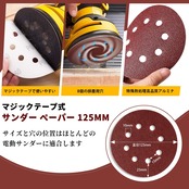 【使いやすさマジックテープ式・優れた放熱性】125mmディスクペーパーはマジックテープ式で簡単に脱着可能、優れた密着性により作業時間を短縮し、研削効率を向上させます、8つのダスト除去穴が研削時の発熱を効果的に低減するため、ワークピースの焼け付き防止や粉塵蓄積の抑制が可能、作業効率をさらに高めます