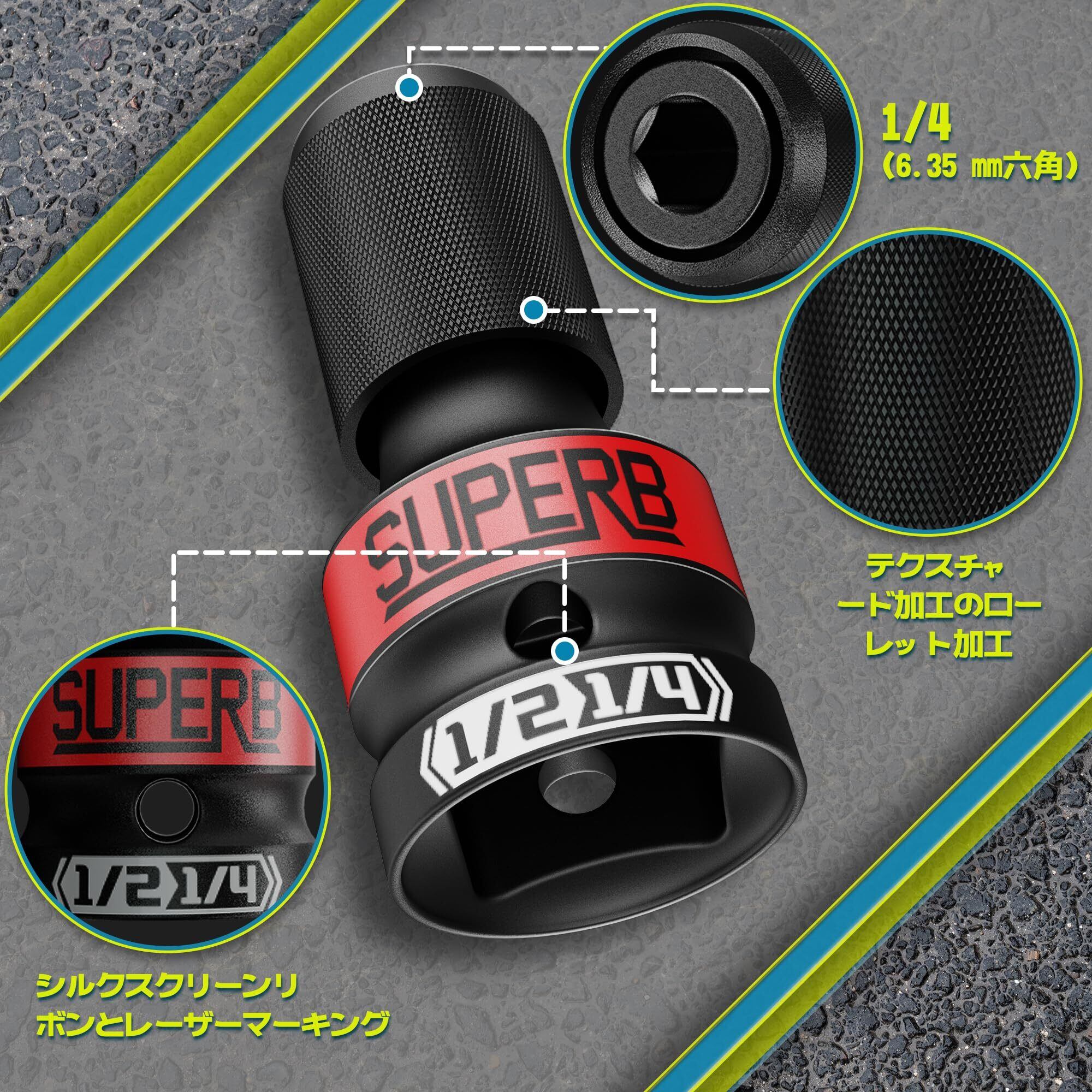 【仕様】1/2(12.7mm)角-1/4(6.35mm6角)ソケットアダプター。差込角12.7mm(1/2インチ)のインパクトレンチに取り付けて、各種ドリルビット(六角軸6.35mm)が使用可能です。差込角12.7mmインパクトレンチ用です。六角対辺6.35mmビットが使えます。