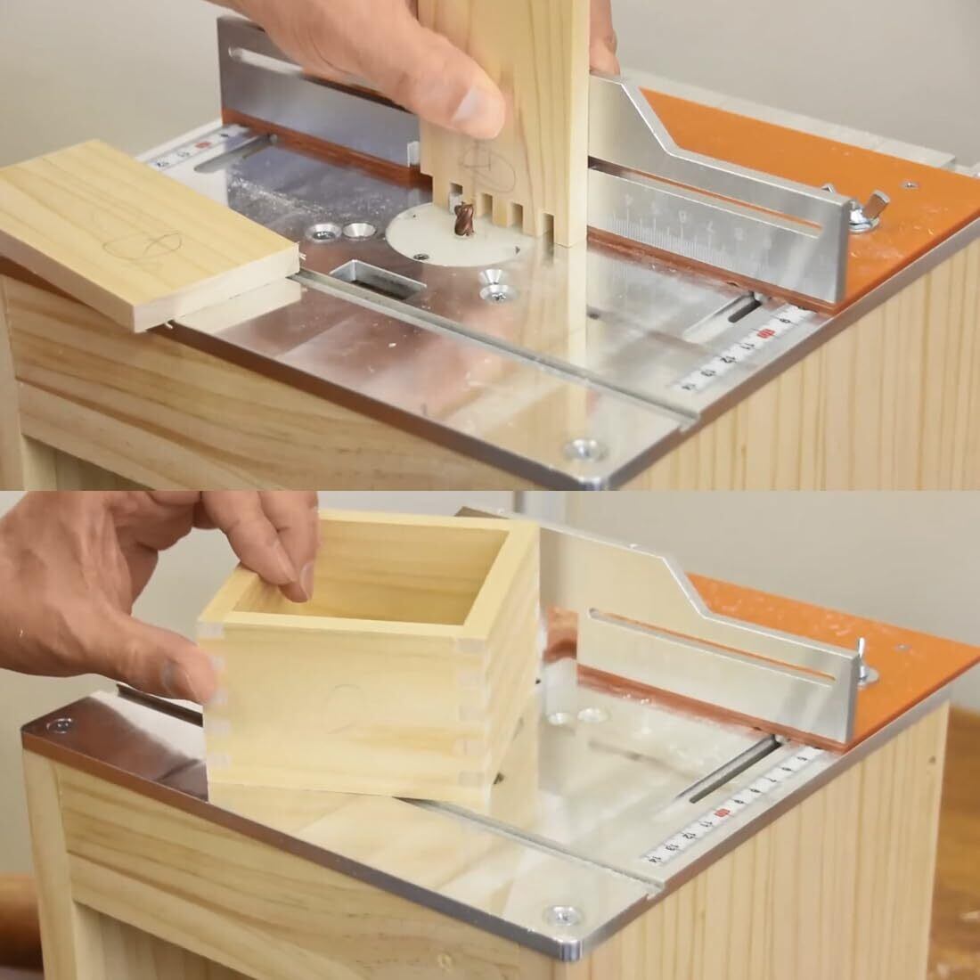 【安全性アップ】:プッシュブロックと合わせて木材を前に移動し穴を開けます。穴あけや溝入れを適切な位置で安定して行うことができ、ミスを大幅に削減していきます。キックバックを防ぎ、トリマーから手と指を保護することができます。