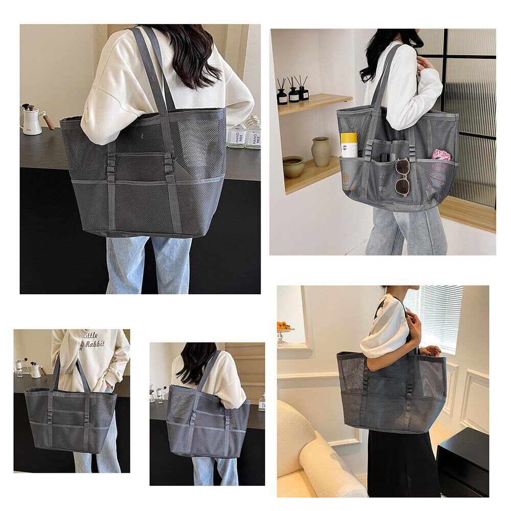 【9個ポケット付き、超大容量】:このメッシュバッグは9つのポケット付き、●:1*メインポケット:大容量で衣類、化粧品、おもちゃ、タオル、濡れた衣類、乾いた衣類など、必要なものがすべて収納可能! ●裏*3+正面*4のポケット:水筒、スリッパ、メガネ、水泳用品などを前面のポケットに収納でき、取り出しやすく使い勝手がよいです。●内部にファスナー付きのPVC防水ポケットがあってスマホ、財布、キーを収納可能。●表にはカラビナ・フックが付けて、ガラス、鍵などを掛けることができます。きちんと区分けして抜群な収納能力を備えています。