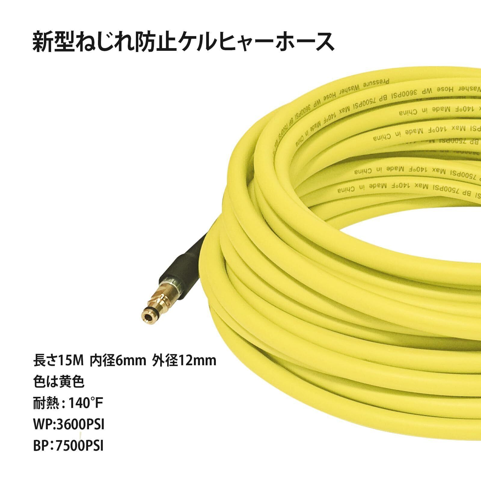 【製品仕様】 長さ15M、内径6mm、外径12mm、色は黄色、耐熱 : 140℉、WP:3600PSI、BP:7500PSI、ャーK2,K3,K4,K5,K6,K7に対応、ねじれ防止スイベル、エクステンション、収納バッグ付き