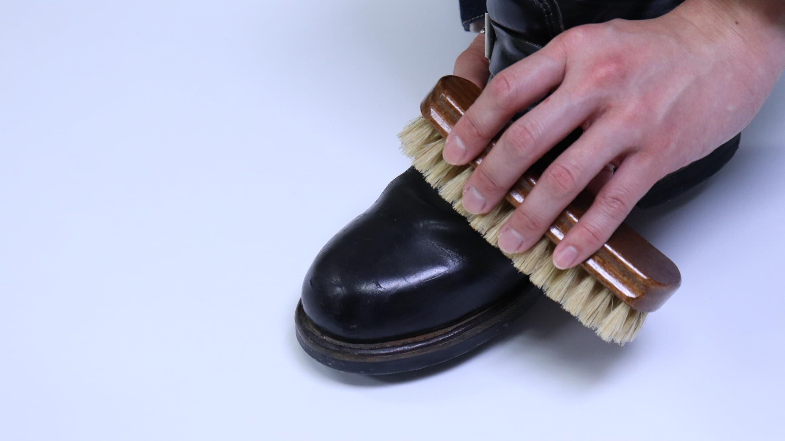 靴クリームを塗りこんだ後にしっかりとクリームを馴染ませながら、全体に広げ、余分なクリームを取り除きます。