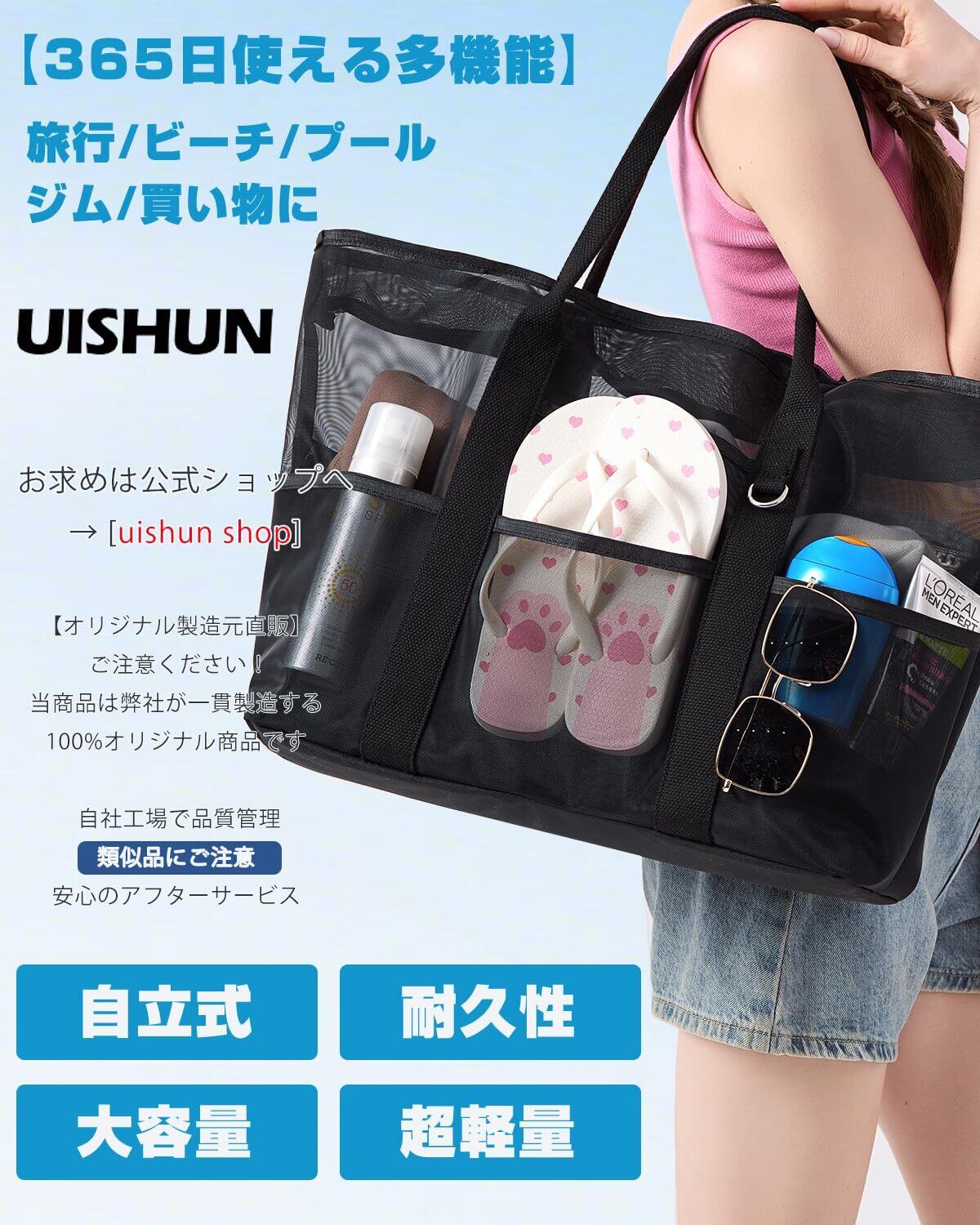 [uishun] ビーチバッグ プールバッグ 【自立式×耐久性×軽量型】【従来品より30%高密度】メッシュバッグ 大容量 温泉 大人 beach bag ジム 銭湯 水泳用